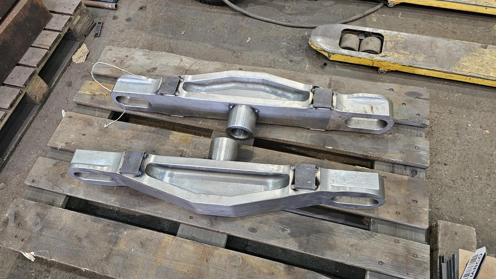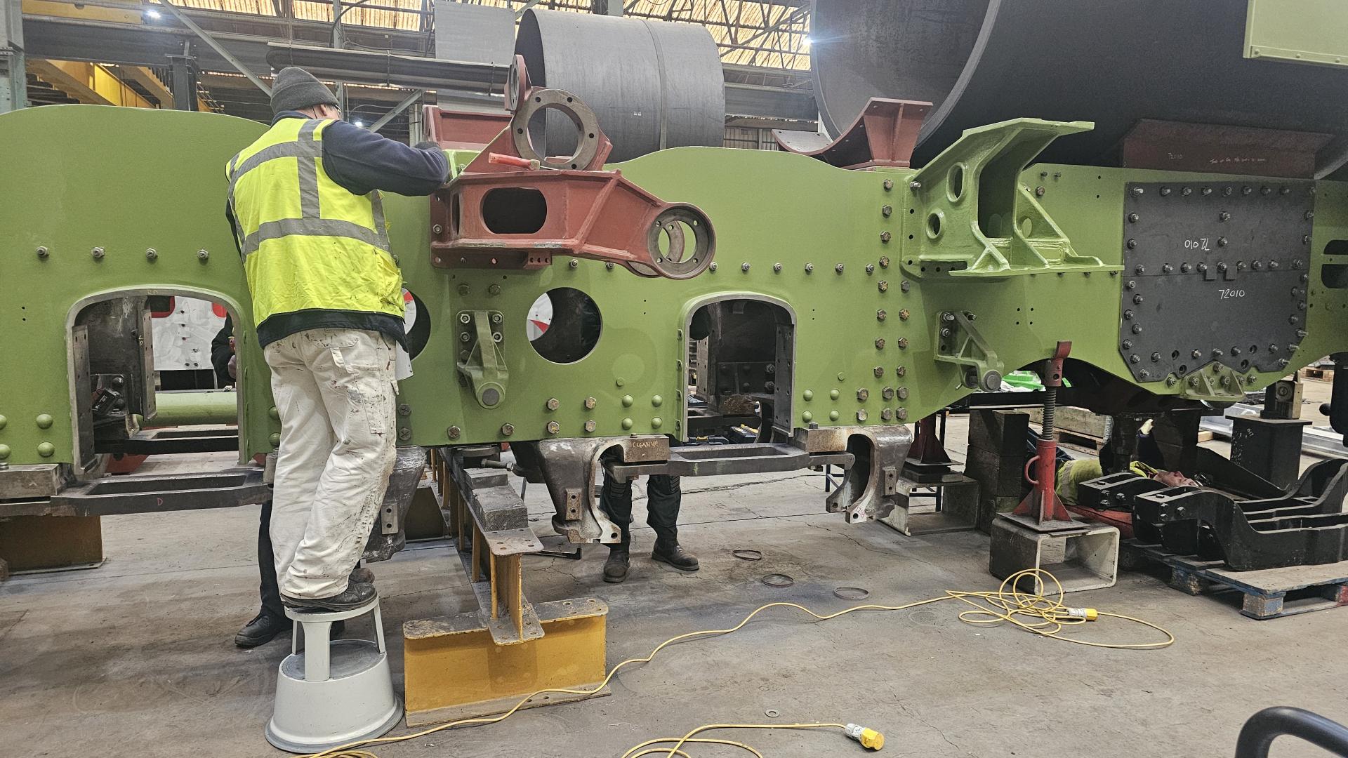 | Welding of the pony truck spring beams has been started at CTL Seal. The manganese liner plates have been tack welded to the sides of the spring beam. These will act as bearing surfaces to similar manganese steel plates welded to the sides of plates on the pony truck frame. Spigots have also been tack welded to the bottom of the spring beam. Full welding is scheduled to follow soon. | |