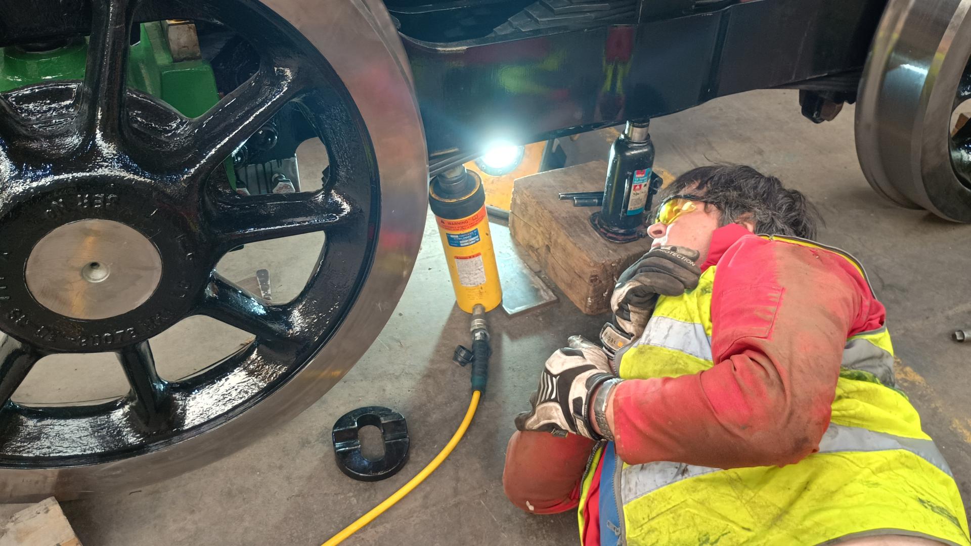 | The challenge is to get the oval shaped cotters into the spring links that connect the spring cradle to the suspension spring. Fortunately the spring has a small recess on the under side that Mike can get one of his Enerpac jacks to engage in. We managed to get 3 of the 4 cotters in just using the weight of the bogie against the upward push of the jack. For the fourth cotter we needed 13 tons of CTL Seal's concrete test blocks lightly resting on the frames so the jack had something to push against. | |