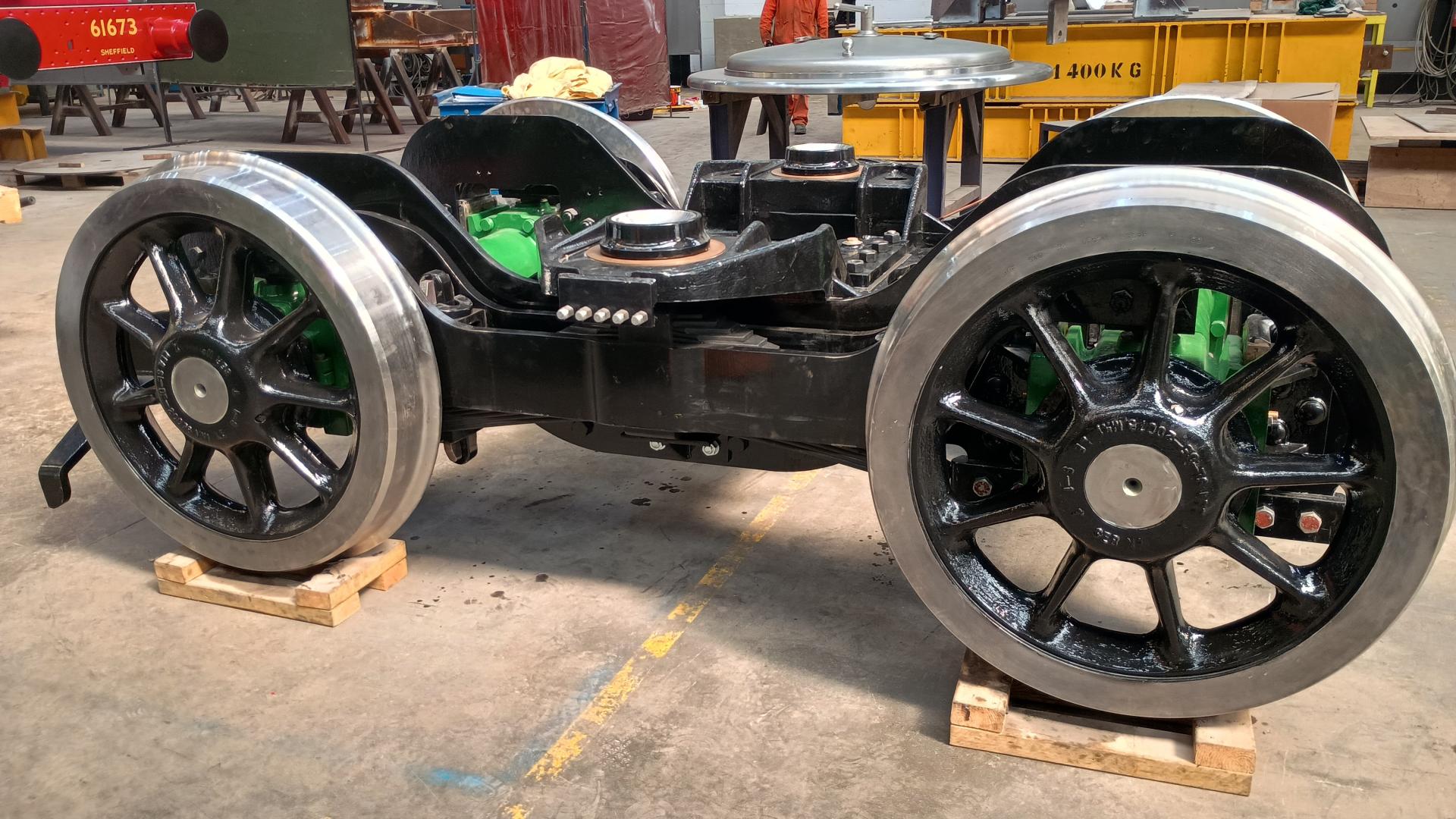 | Finally an almost complete bogie. We should be ordering the side control springs in a couple of weeks and the lubrication pipework will need installing. With the frame keeps fitted, we can now do final checks on the axlebox guide/axlebox interface to determine the clearance. This will determine the final machining stage for the axlebox liners. This will take place after the Greatest Gathering in August. Photo by John Hind | |