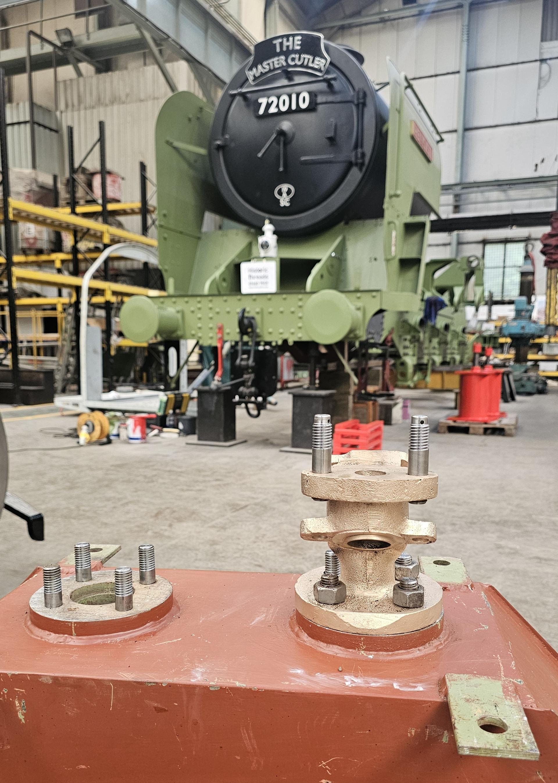 | One of our projects is the sanding gear. Unlike the first batch of Clans which had 2 sandboxes, 72010 has 3 sand boxes. The additional sandbox provides sand to the leading coupled wheel. Bolted to the bottom of each sand box are 2 or 4 sand traps. In the photo, the sandbox is upside down and the sand trap can be seen on the right. We needed a number of studs to secure the sand trap to the sandbox and delivery pipes to the sand trap. We contacted Historic Threads (https://www.historicthreads.co.uk) as they specialise in British Standard threads "from the biggest Whitworth to the smallest BA and everything in between". They offered to sponsor the studs and we are very grateful for their sponsorship. The studs on the top of the sand traps (in the photo) have been drilled so that a split pin can be fitted once the nut has been tightened. |