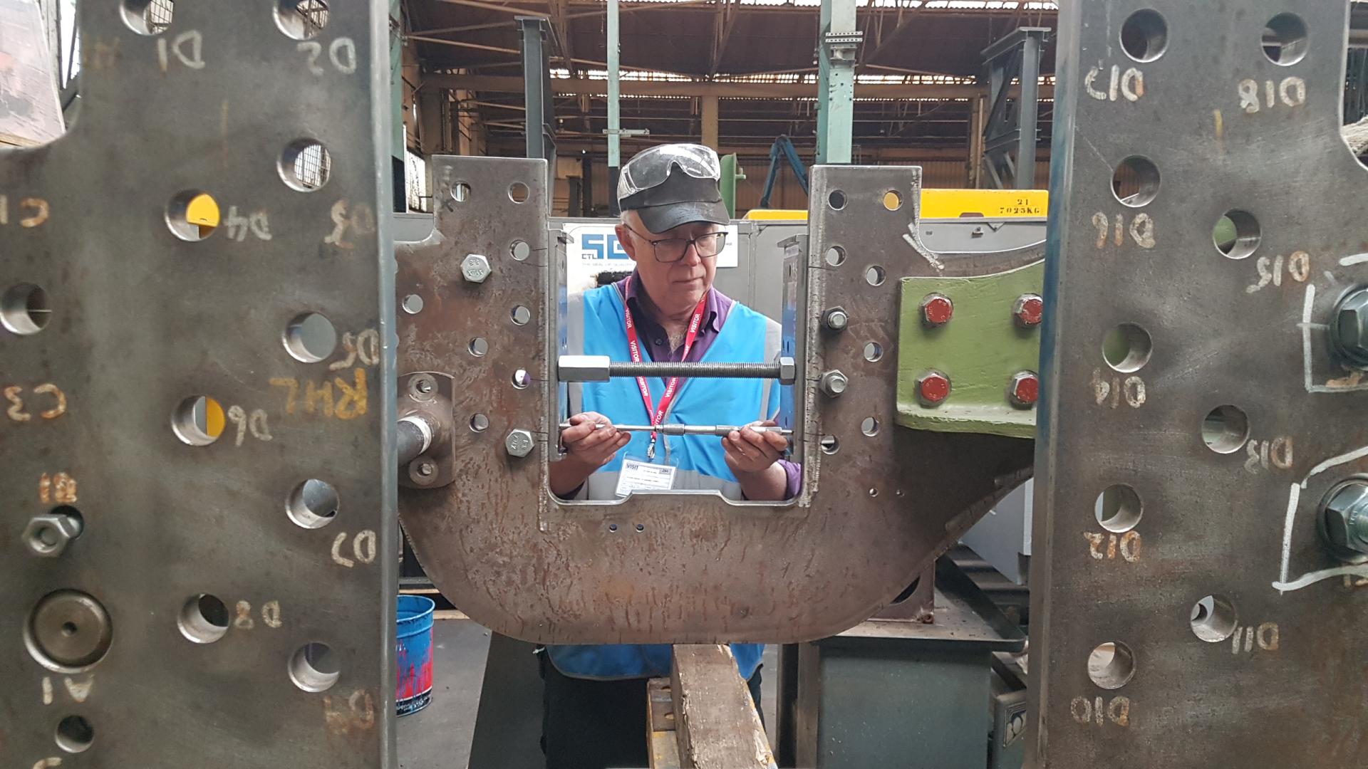 Our next job with the axlebox liners will be to fit them to the bogie frames with yet another set of fitted bolts, 7 off per axle box guide. We will need to ensure that the axlebox guides are firmly up against the bogie frames. The upper bar in the photo is using a threaded bar as a jack. Ideally we need a pair so that the top and bottom faces are jacked. Once the axlebox guides are fully bolted, we will need to measure the distance between the faces. John is using an internal micrometer to measure the dimension as a trial. CTL Seal are currently manufacturing the axlebox liners that are bolted to these faces. This consist of a steel liner and a manganese steel face that will face a corresponding manganese steel face on the axle cannon boxes. The aim is to get a 0.010" to 0.017" clearance between the axlebox and the axlebox liners. |