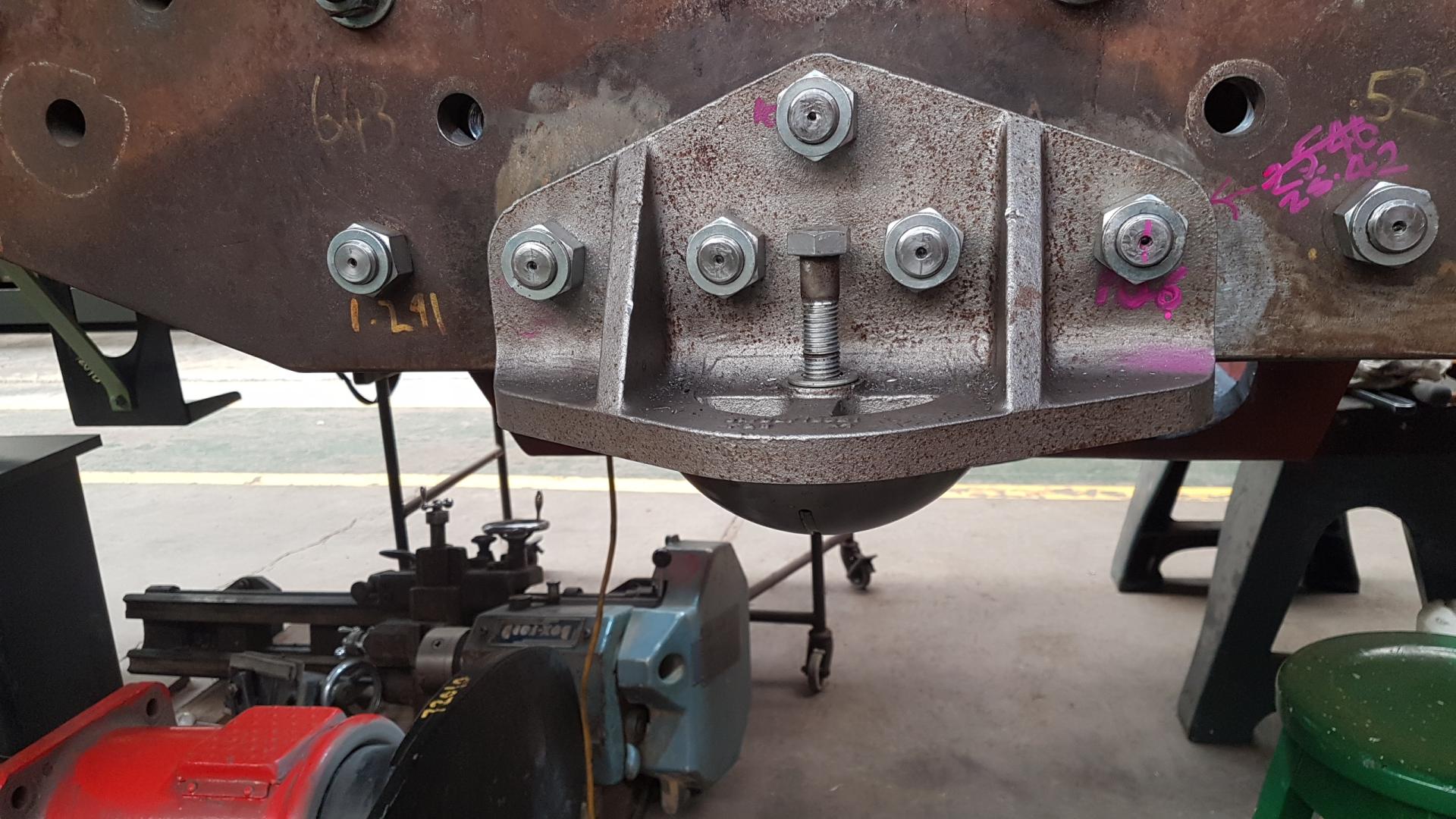 The job of the bogie bolsters is to transmit the weight of the front of the locomotive to the bogie. The dome on the bottom of the bolster rests in a bolster cup that can "float" on a brass pad on the bogie stretcher. Fitting these bolsters has been a long job. The bolts are fitted bolts requiring a heavy drive to get them into the holes. The bolt heads are coned (rather than hexagonal) and are fitted from the inside. Consequently its very difficult to drive them in with a hammer. We've used a hydraulic jack for this job. To get a heavy drive bolt, the bolts have to be slightly oversize on the shank. If the shank is too big a diameter, then the bolt cannot be forced in. If the shank is too small a diameter then it will not provide the tight fit we need. So we specify the bolt shank to a tight tolerance. The other complication is that the bolt has to fit through 3 thicknesses of steel - the bogie pivot stretcher, the main frame and the bogie bolster. Today we achieved a milestone and all bolster bolts are fitted! |