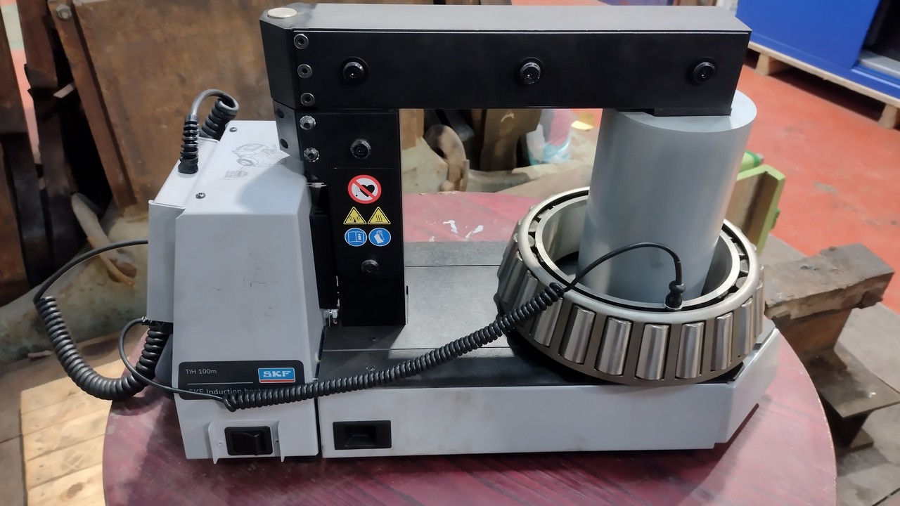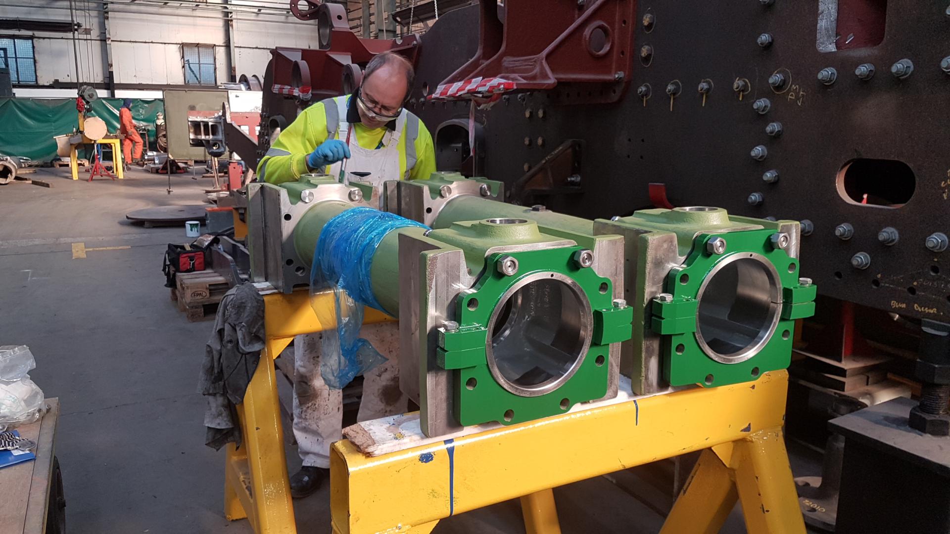 Down at South Devon Railway Engineering, work started on assembling the cannon boxes. An induction heater has been used to warm and expand the bearings so that they will slip easily onto the axle. |