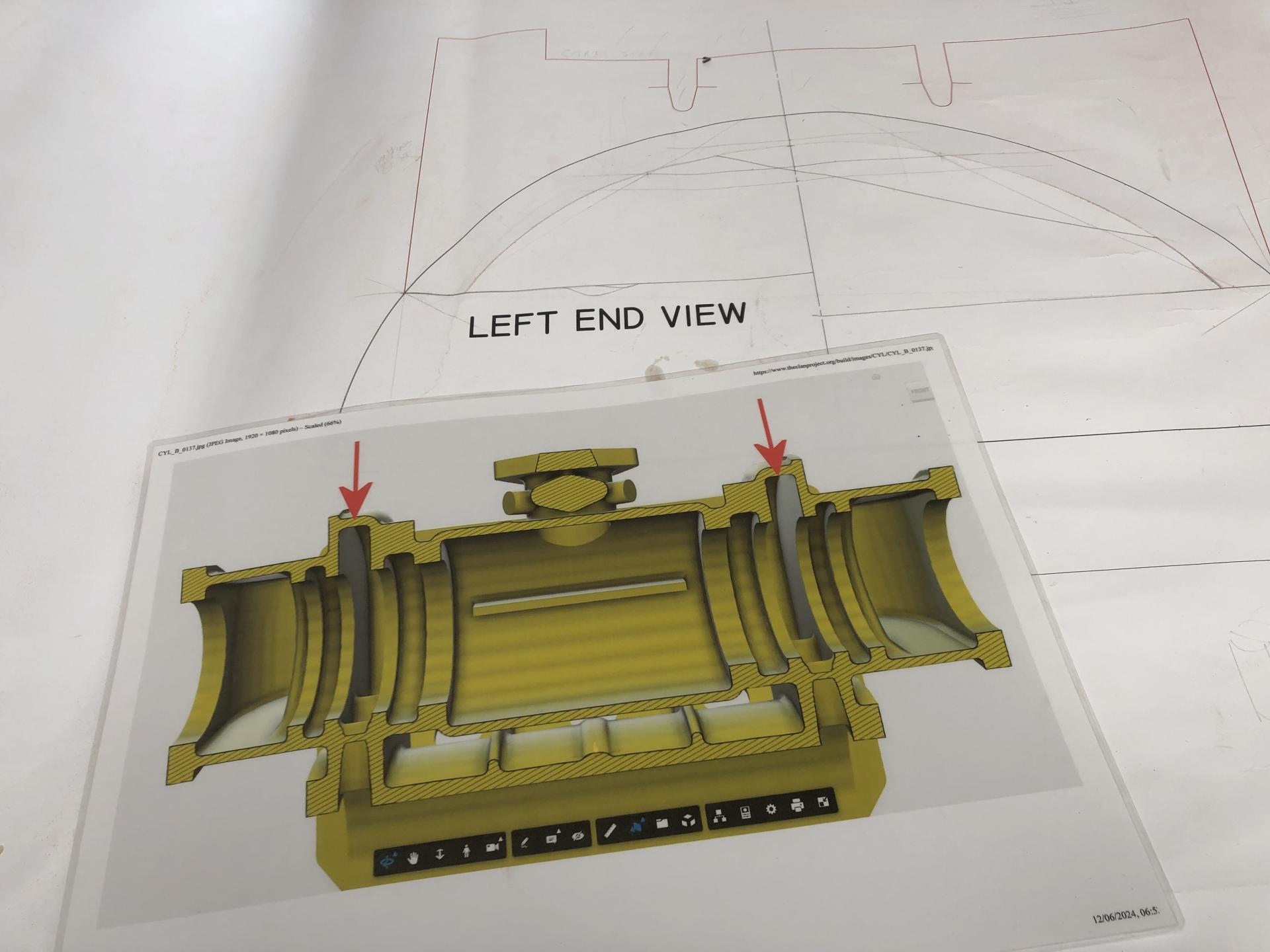 Ruth is using the cross section image from our 3D model to design the loose pieces for the transfer ports that convey steam between the steam chest and the main cylinder. Corresponding loose pieces will be required for the steam chest core box and a joint between the 2 sets of loose pieces will be required. Having settled on the shape of the steam transfer ports loose pieces, Ruth is now working on the final shape of the joint between the upper and lower section cores. The main pattern join, has a locating step at these points but Ruth thinks, from a foundry point of view, the core would be better without a step to ease the core production method. |