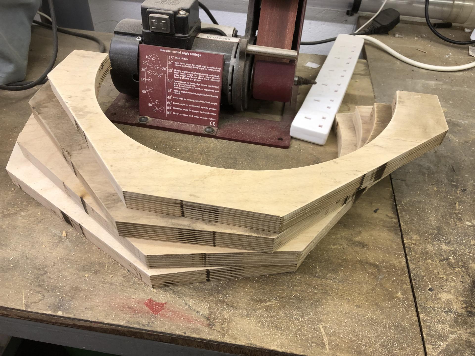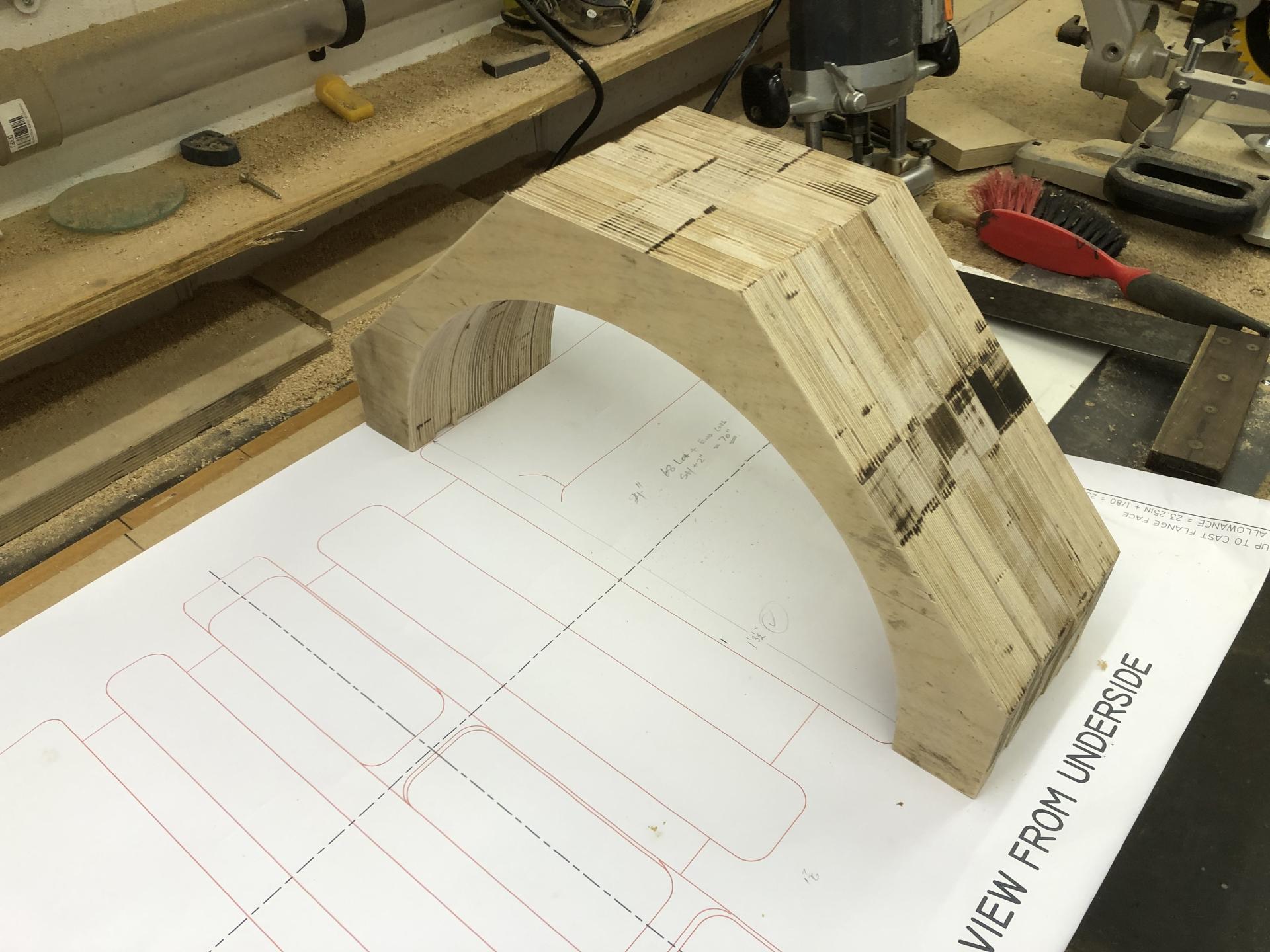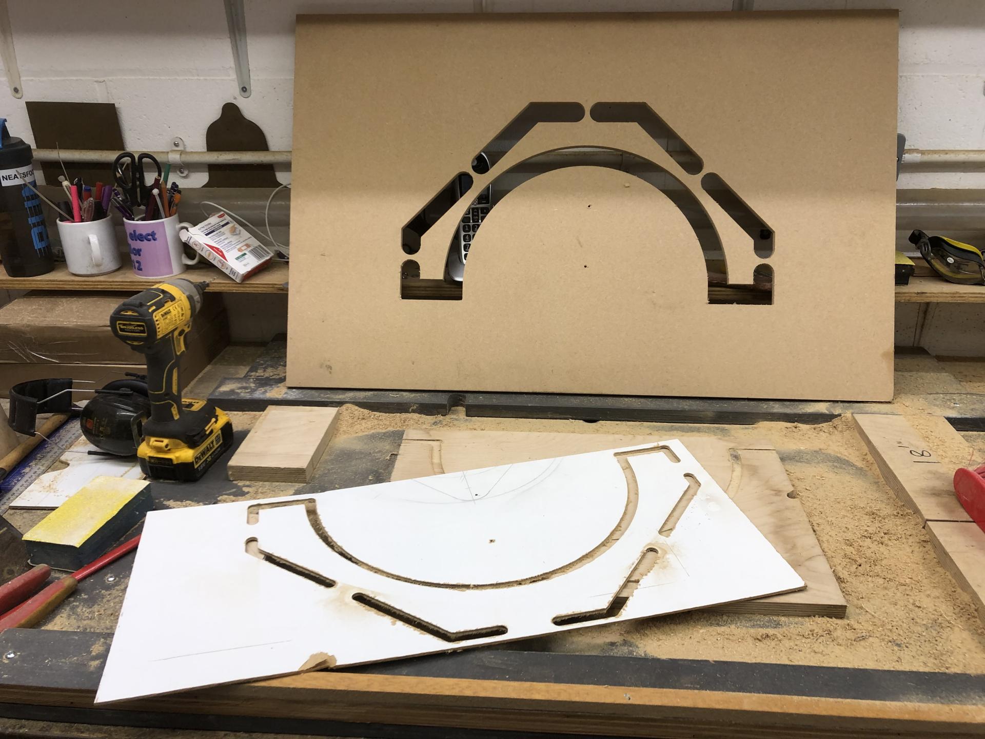 Tony will use the same system as used for the mccb with multiple "U" sections joined together. Whereas the mccb was a constant diameter throughout, it can be seen from the drawing above that the steam chest core box involves U sections with different diameters and different thicknesses. The image shows a trial run with one of the three diameter templates for routing. |