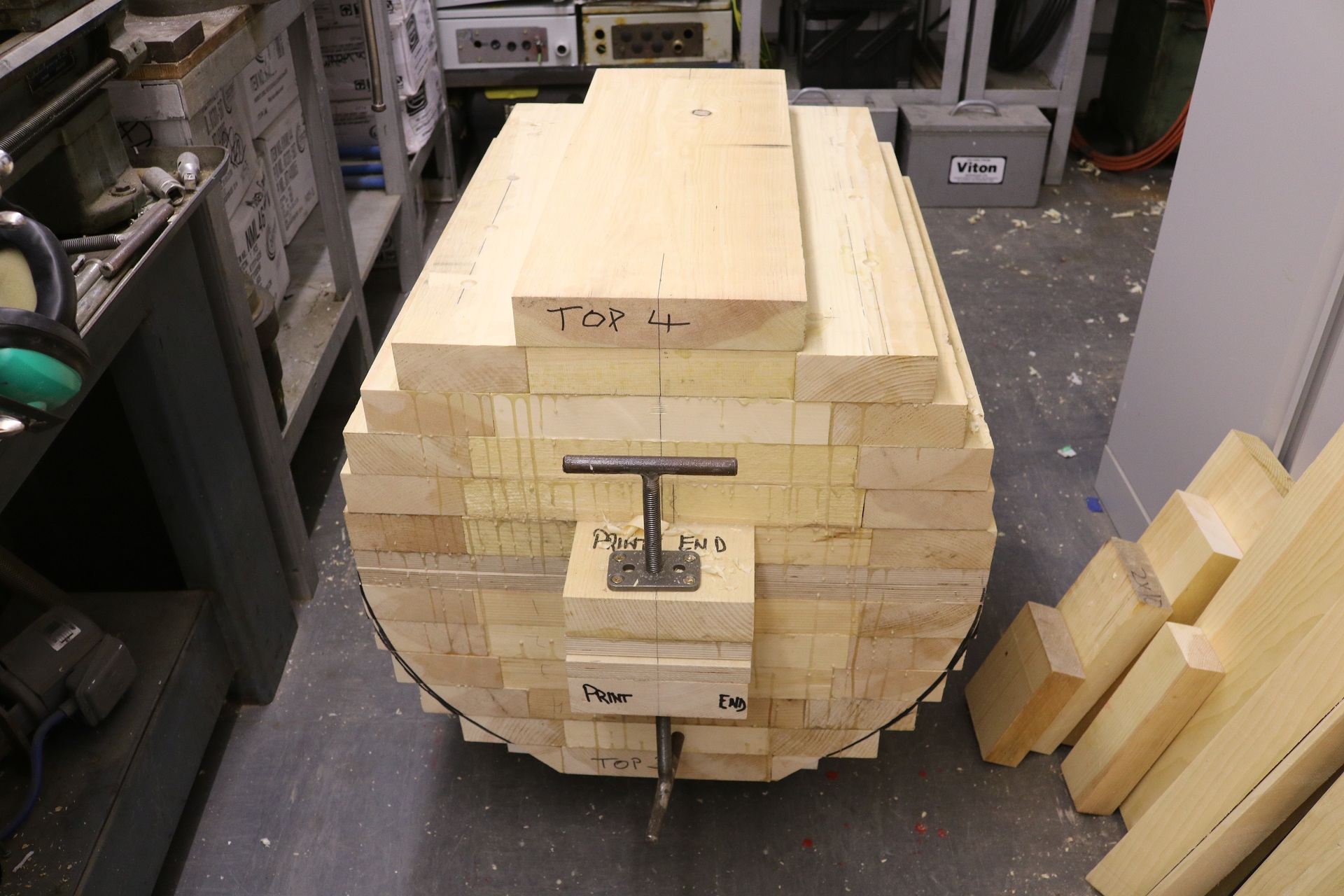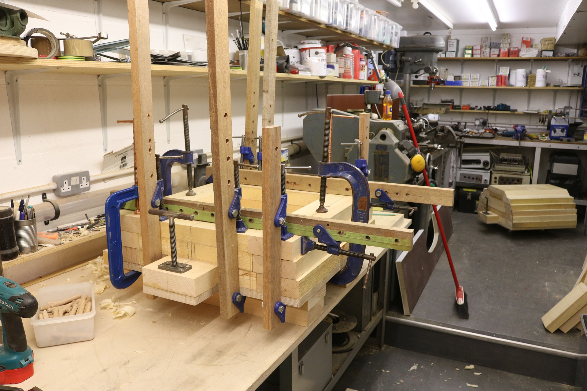 Assembling the boards needs glue, pressure and lots of clamps! You can see a completed half semi circle pattern in the background, 3 more to go. |