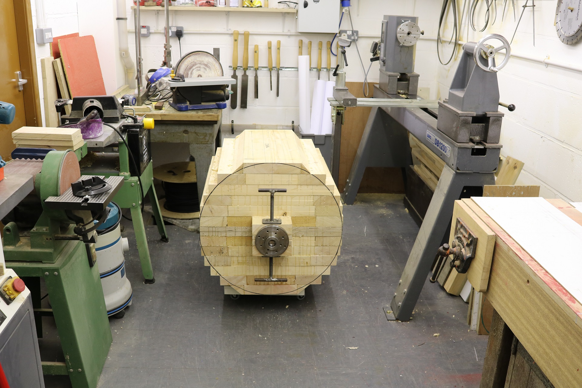 "Before I started turning at all I cleaned down to the marked circle with a power plane. Moving on to the turning, I started at low speed with a large roughing gouge slowly increasing speed up to around 400 RPM.