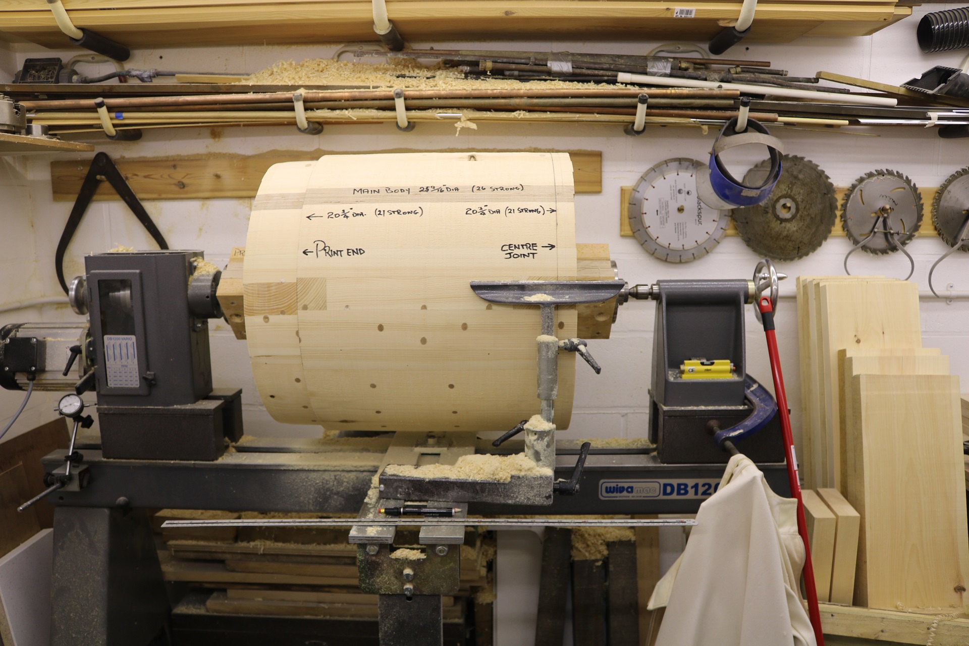 The 2 halves of the motion cylinder pattern are located together ready for lifting onto the lathe. The lathe is on the right. |