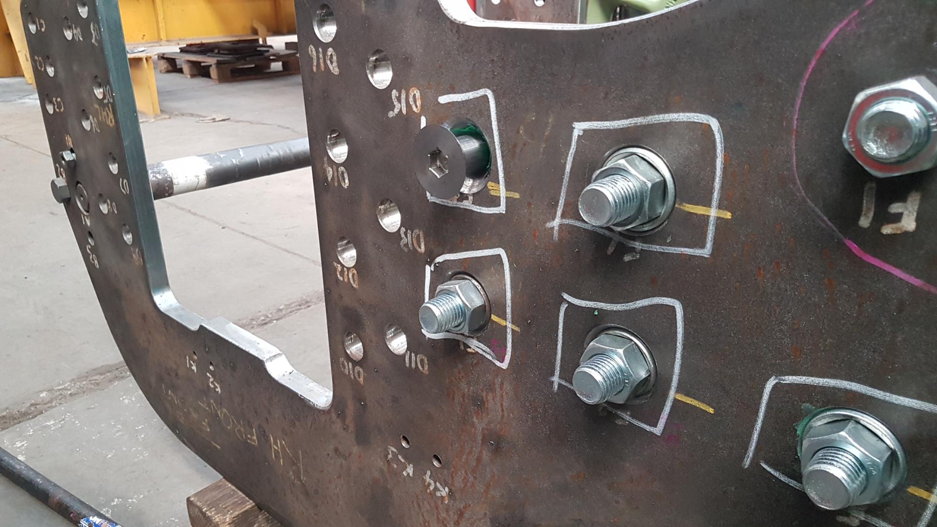All of the countersinks have been formed in the bogie frame and the frames were moved back to the assembly shop at CTL Seal. Next week we aim to start installing the countersink head bolts which are necessary to ensure that the bolt head does not foul the bogie spring cradle. You can see a trial fit in the photo, The nuts are on temporary bolts to ensure that the frame plates are locked in position on the stretcher. Cupped washers have been used to avoid damaging the countersink. |