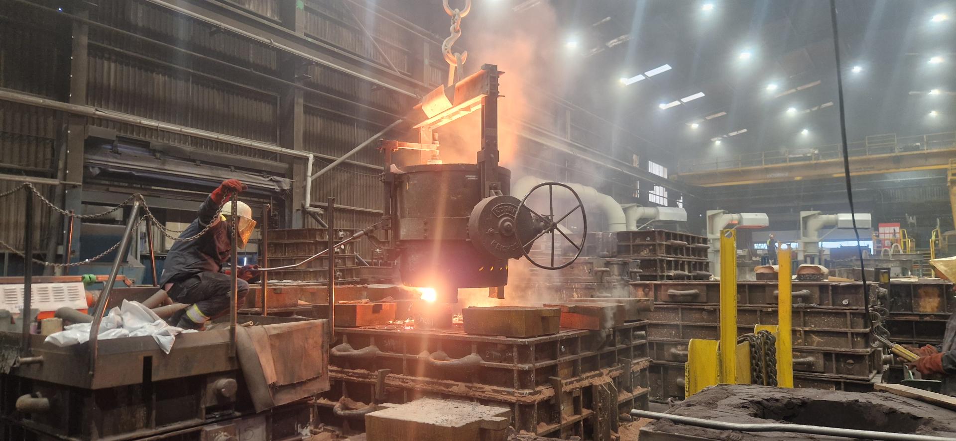 William Cook have cast 2 of the leading/trailing coupled wheels at their foundry. Here molten steel is being poured from the ladle into the mould. The casting will be allowed to cool down over the weekend before the wheels are broken out of the mould. Photo courtesy of William Cook Cast Products Ltd. |
