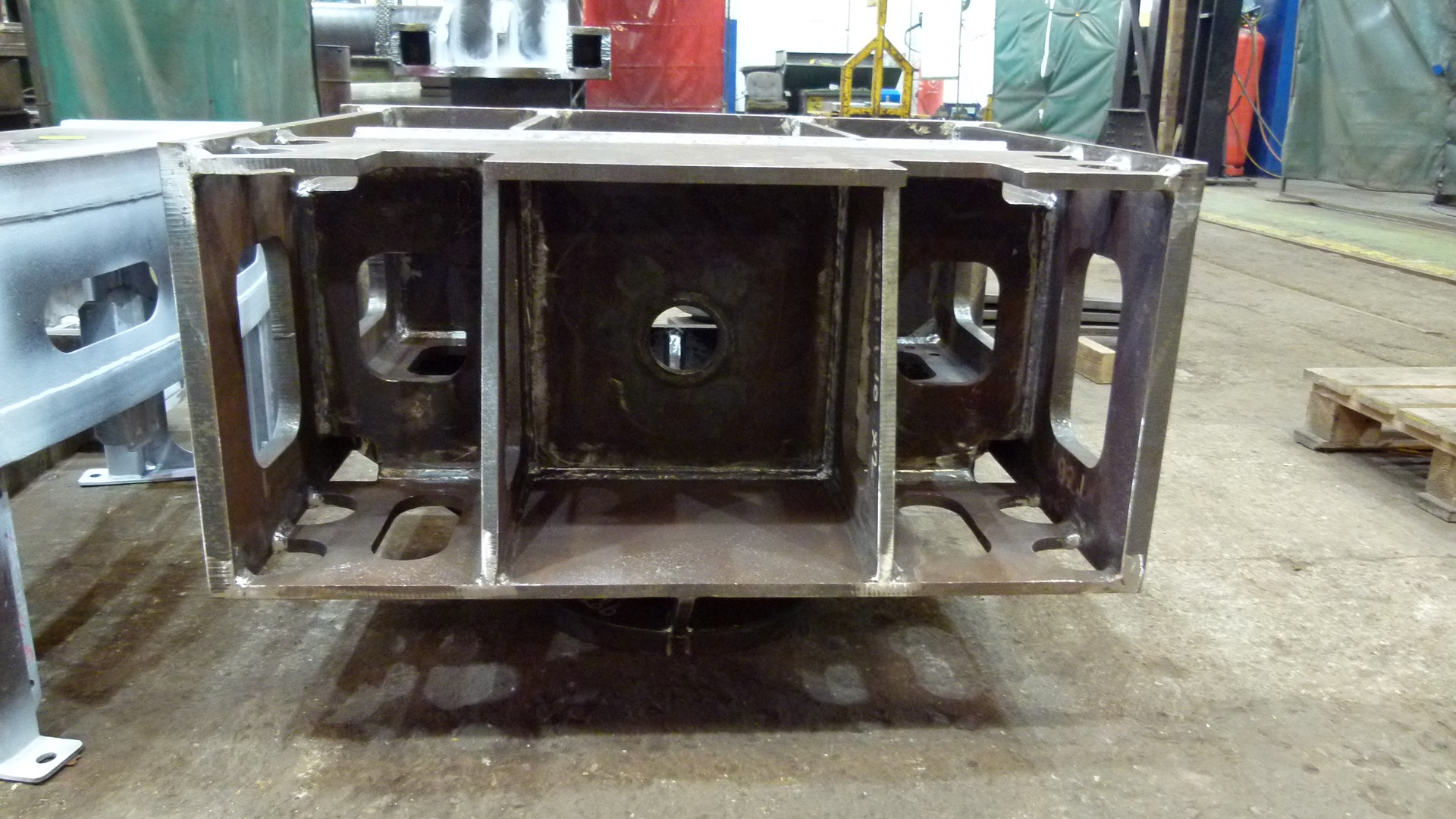 This is the front of the dragbox. The drawbar passes through the hole in the centre and the drawbar spring bears on the central plate. We were concerned about the loadings on the front plate which Finite Element Analysis showed were on the high side. Therefore we added 4 strengthening plates to the rear of the front plate, 2 at the top and 2 at the bottom. |