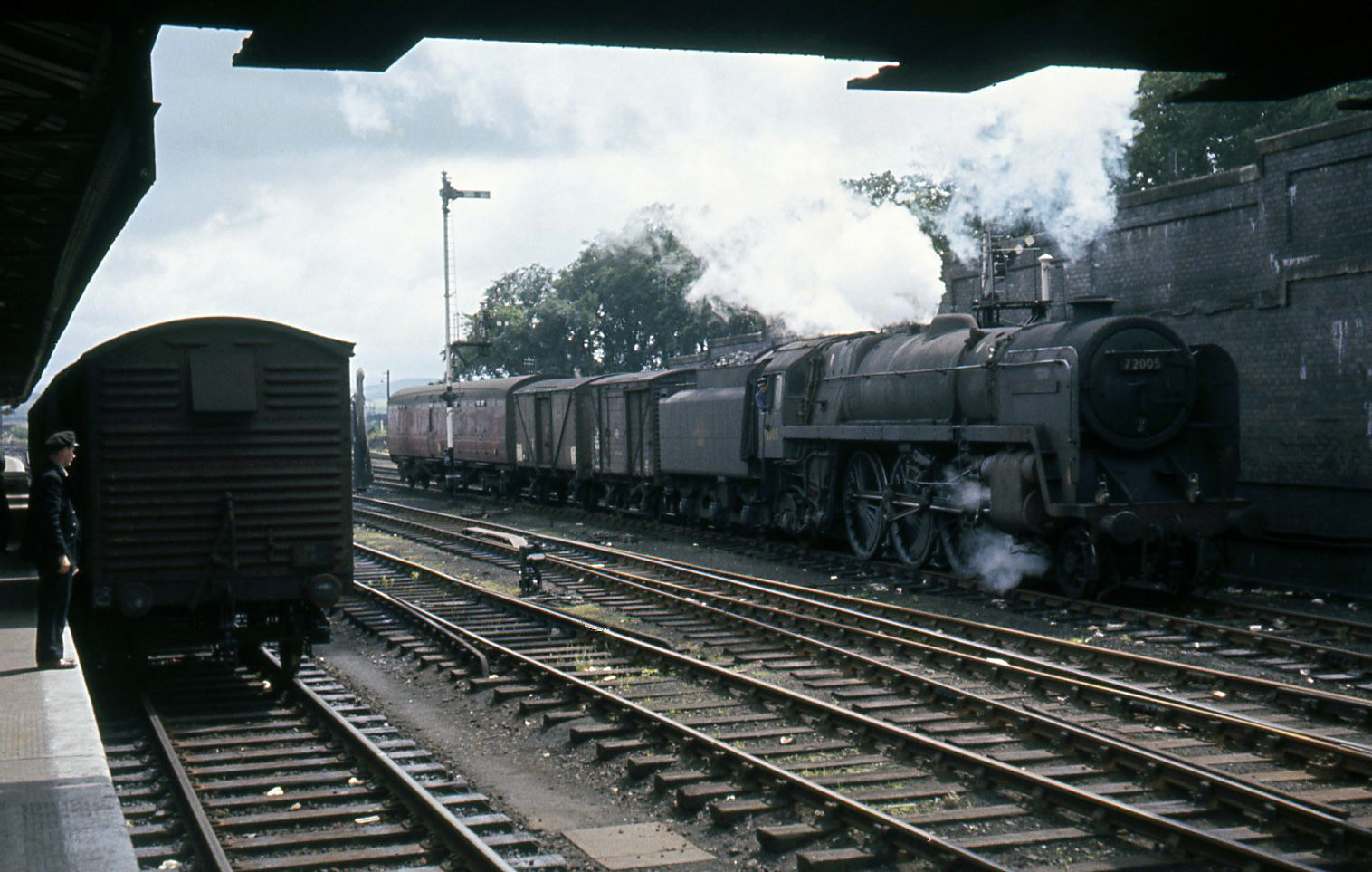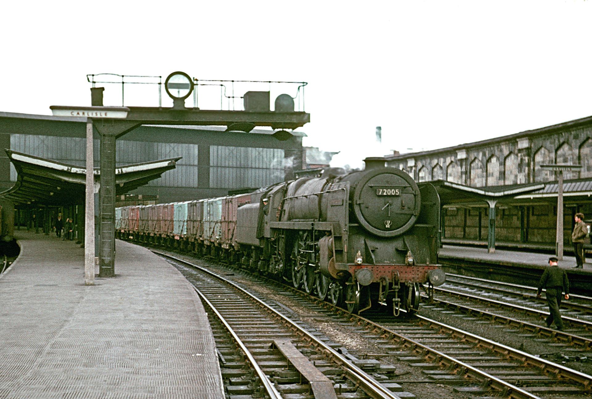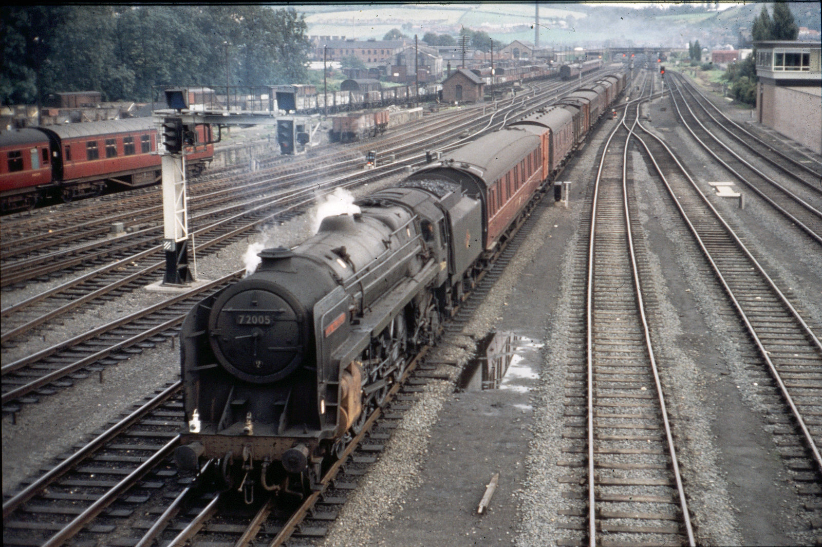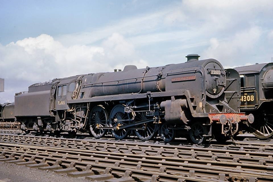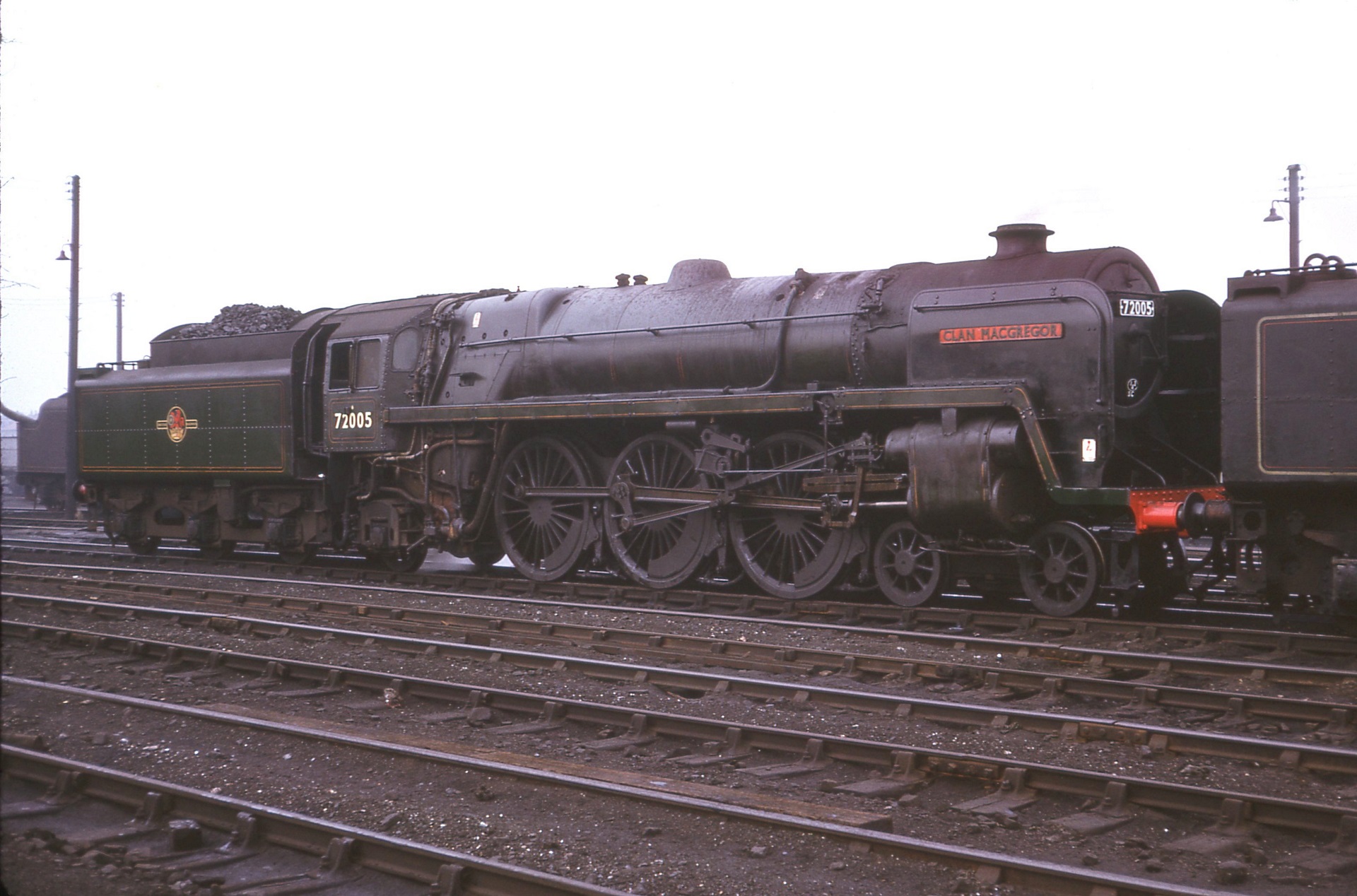72005 at Carlisle Kingmoor in 1963. From the W.Potter/Mike Moran collection. A Thompson B1 in the right background and what appears to be a LNER Pacific tender on the left background. |
