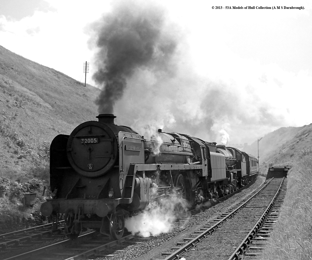 72005 as pilot engine arriving at Shap Summit. The train engine could be a Jubilee with a Fowler tender. |