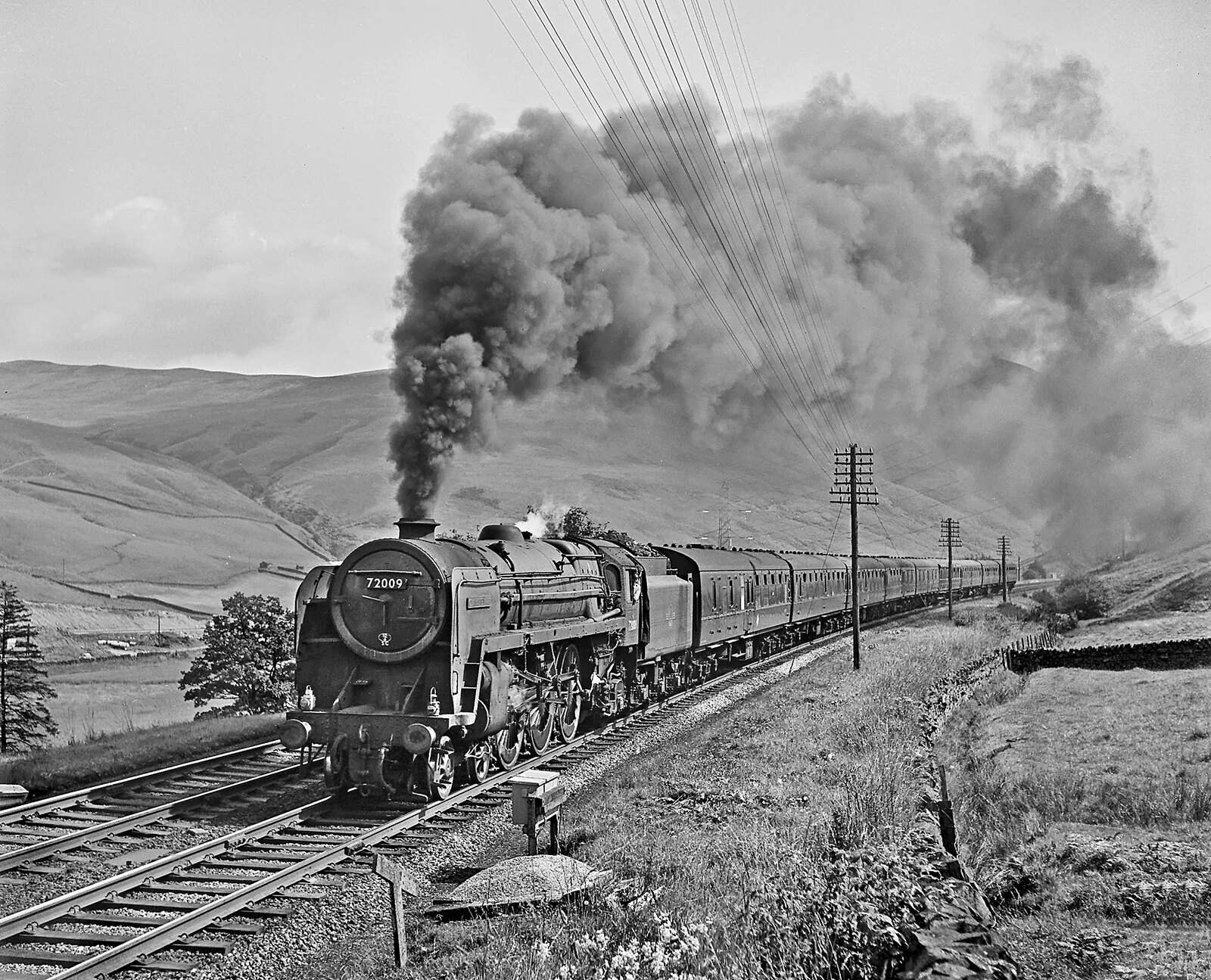 A fine picture of 72009 attacking Beattock with 9 coaches and no banker. The photo is taken close to where the railway used to cross the A74. |