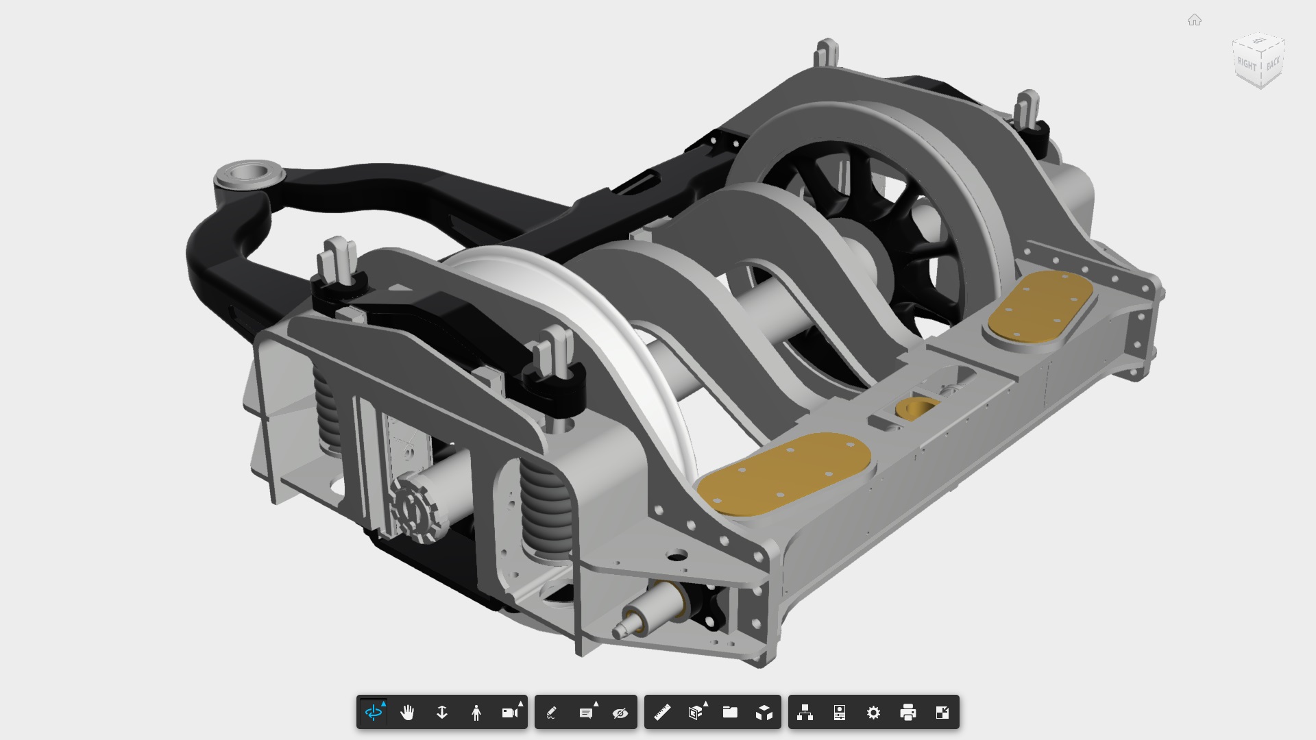 On the oval bearing surfaces are 2 bolster cups which can slide on the oval pads. The bolster cups engage with bolster domes that are bolted to gussets at the rear of the locomotive frames. This system allows the pony truck to pivot around the forward pivot as it negotiates curves in the track.