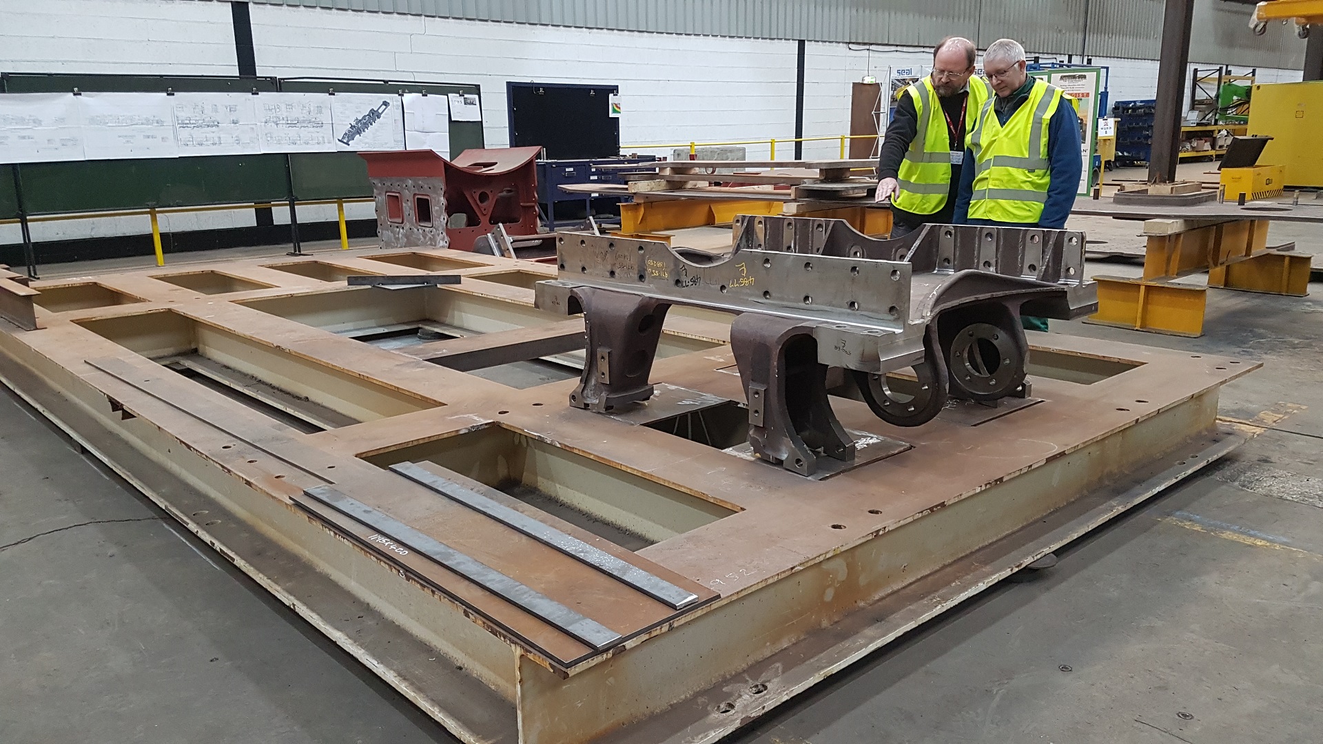 When the frame plates are put in position on the stretchers, a key alignment requirement is to ensure that the 3 driving axles are in aligned in a horizontal plane. The British Railways frame drawings provide 6 datum point holes, 2 each side of the driving axle centre line. When all 6 of these datum points are in line, the frames have been set up horizontally. Here Keith and Alan inspect the datum point markers which CTL Seal have started to make. The 3 datum point markers are the dark coloured material which Alan has his hand on. We're aren't sure what the 3 silver/yellow markers are for. | |