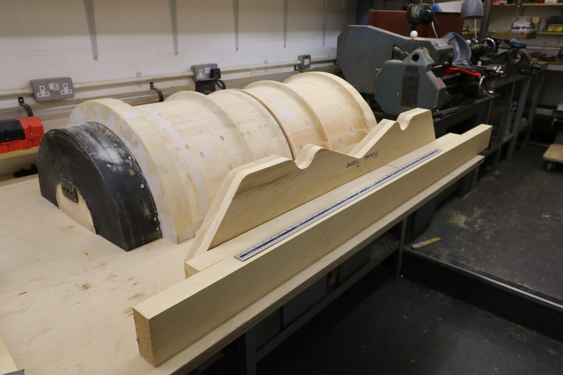 Tony is now working on the patterns for the flange plate and the webs that connect the flange plates to the cylinders. Here is the first view of the 2 halves of the cylinder pattern sitting on the bench together with the flange pattern. This will form the bottom of the 4 layers that will make up the complete pattern. Tony has just taken delivery of a batch of wood so that he can start making the webs. |