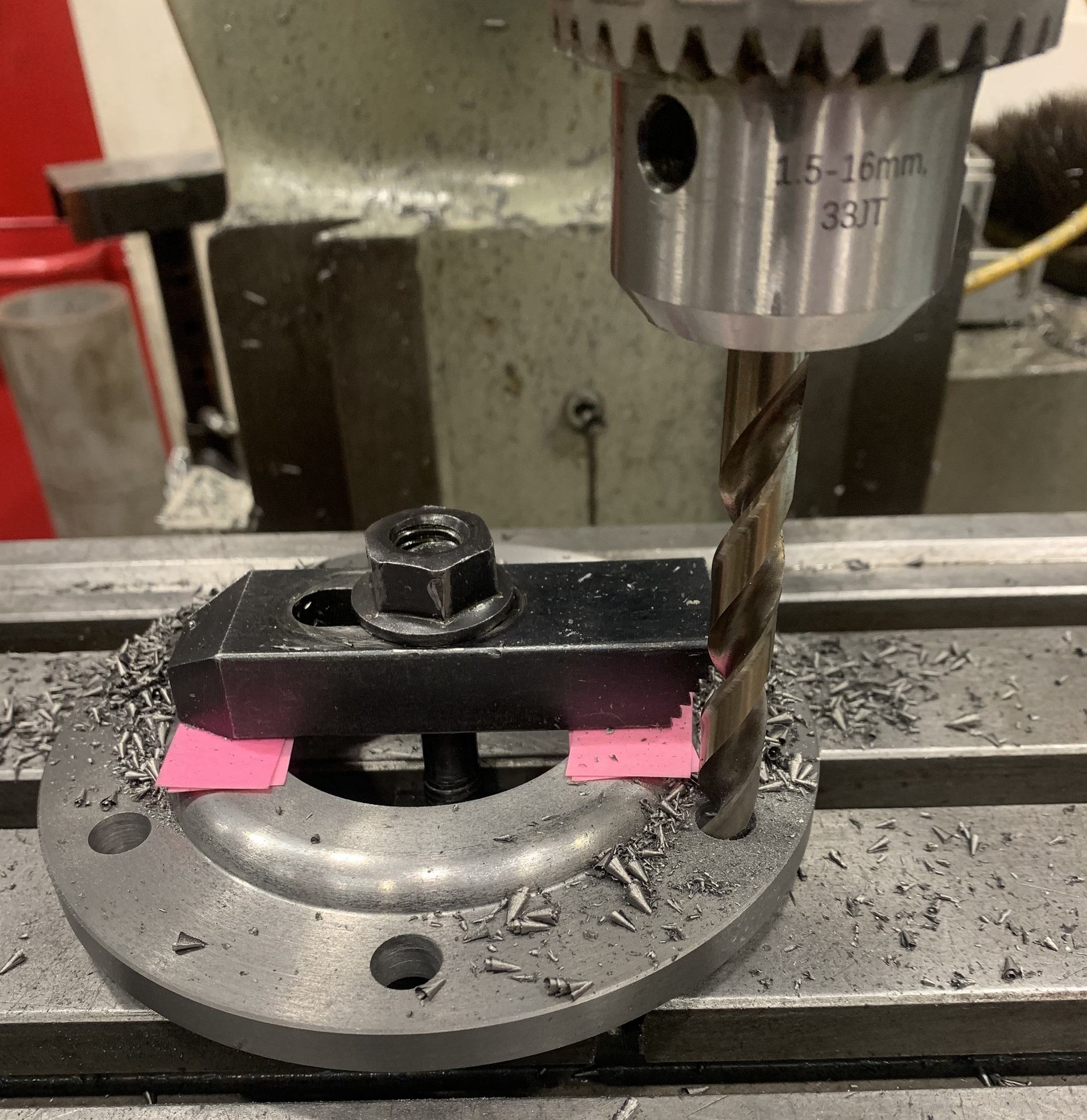 The final job on the hornguides is to drill and tap the grease lubrication holes to the hornguide faces. As these go onto the hornguide at an angle, it was decided to do this back in the assembly shop using a jig for the drill. Here you can see the hole being drilled out. The next stage was to drill and tap for a 1/2" BSP pipe fitting. One of our early jobs, once the frames have been painted, will be to fit the pipework for the hornguides. For the sharp eyed, the bolts on the right are temporary fitting. |