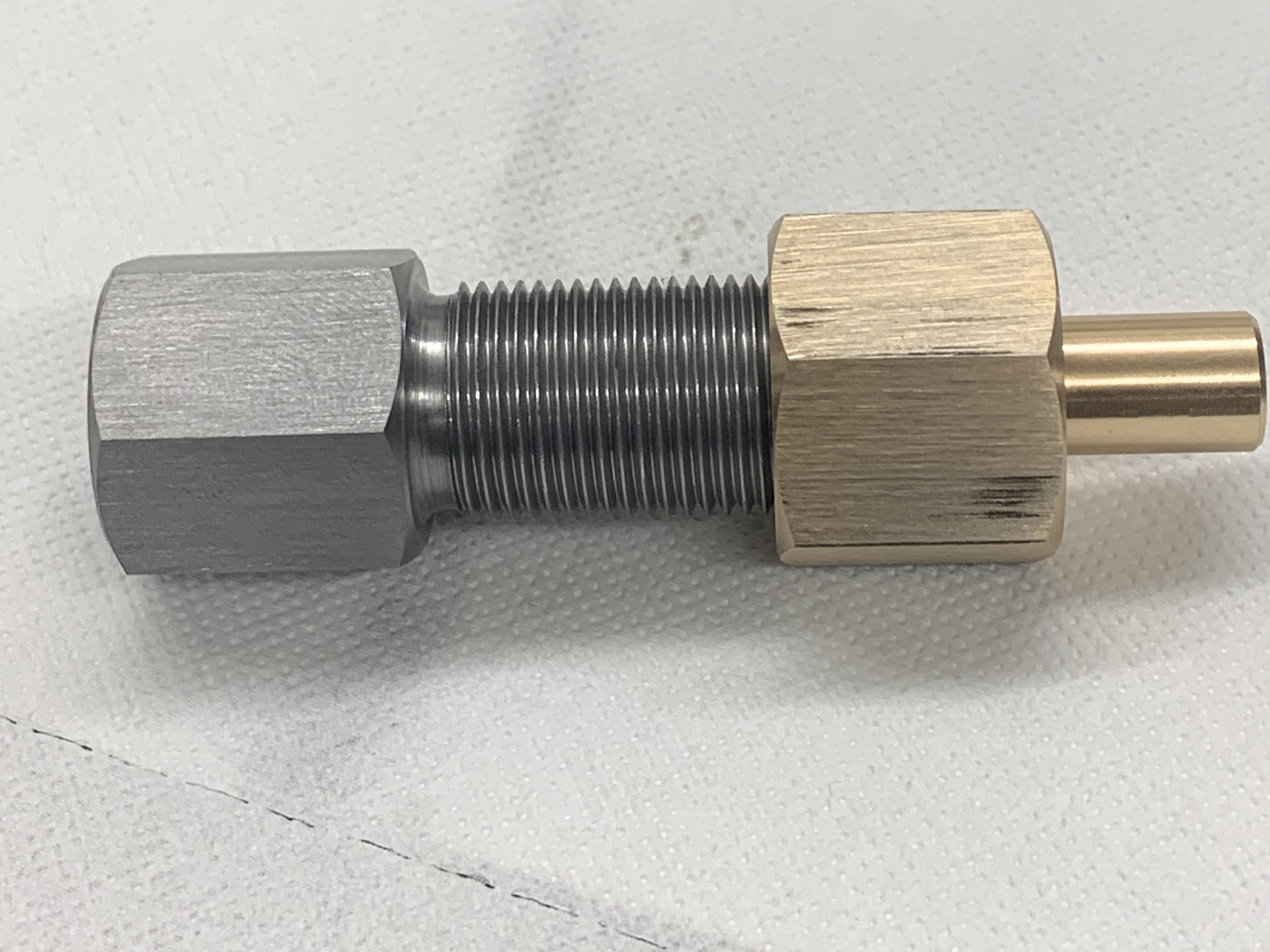 This is how it goes together. The grey steel part is a bulkhead adapter. This is fitted onto a plate which is welded to the outside ends of the main bogie stretcher, one per side. The plate has 5 holes for 5 bulkhead adapters which are ratined by a plain nut. On the left hand side (in the photo) a grease nipple will be fitted. The right hand side of the bulkhead has a internal female taper. The brass nut fits over a separate coned fitting which engages with the female taper. Tightening the nut ensures the cone is mated with the taper and forms a seal. Protruding to the right is a tube which is an extension of the cone fitting. This has an internal diameter of just over 1/4". The cone fitting will be silver soldered to the lubrication pipe. |