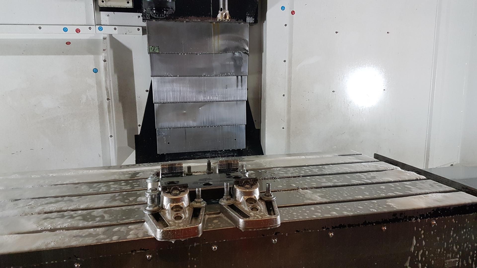 In one of the machining stations at CTL Seal, the axlebox liners are being machined. The liner is the plate with 3 holes in it and the manganese steel surface is being machined to the correct dimension. |