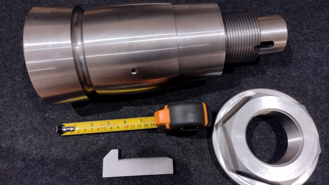 On Monday we collected the pony truck pivot pin from Alpenbury Engineering in Rotherham. The pony truck is a delta truck with the apex of the delta at the front where it pivots. This pin passes through a taper hole at the bottom of the main part of the stretcher, through the bush at the front of the pony truck radial arm and then through another taper hole in a support bracket bolted to the bottom of the firebox support stretcher. A nut secures the bottom of the pin retained by a cotter and split pin. Note that the central part of the pin that engages with cast iron bush in the pony truck radial arm is barrel shaped to allow for roll movements in the pony truck. The hole is for a grease lubrication feed. |