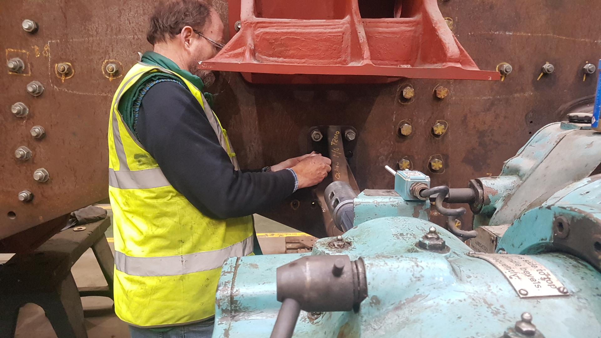 We couldn't do the middle left hand brake hanger bracket last week because Neil was polishing it up for display at the Doncaster Model Railway Show and our stand. So today it was back on the frames and Mike H got to work with the Asquith drill. We have to use a spindle extension as the yellow frame support stands prevent us getting any closer. In order to do the right hand side, we will need to get the frames moved to the left. |