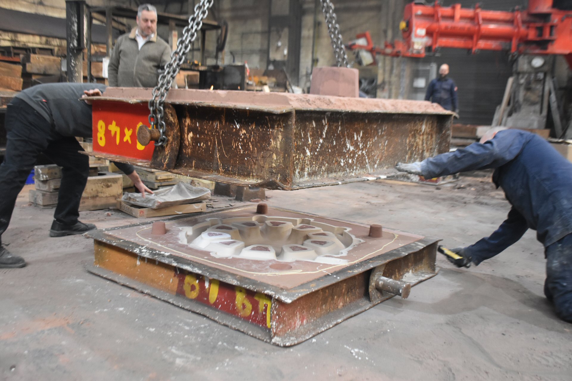 Today, our 2 pony truck wheels were cast at Trefoil Steel, Tinsley, Sheffield. In the photo, the 2 halves of the mould are being joined together prior to casting. Tomorrow, 27 February, the wheels will be broken out of the mould having cooled down overnight |