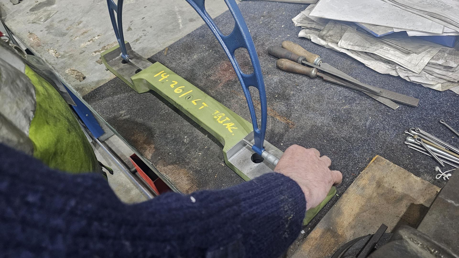 A lot of work is going into cleaning up the frames and getting them painted for the April Open Day. All of the outside hornguide have now been smoothed down and painted. Here Ashley is applying a coat of primer to the right hand motion bracket. The nuts will be painted once a formal torque setting check is complete and signed off. | |