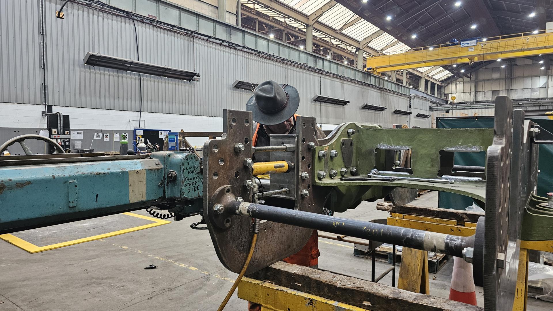 This morning, Alpenbury Engineering had drilled/ream the guide to liner bolt holes on one pair of axlebox guide/liners so Geoff was able to bring them into CTL Seal. We removed the liners from the guides and put them to one side. The axlebox guides were mounted onto the bogie frames and checked they were in the right position. We then used the hydraulic jack and 2 screw jacks to make sure that the guides were seating fully into the horn gaps on the frame. Mike is fitting the temporary bolts in the photo. | |