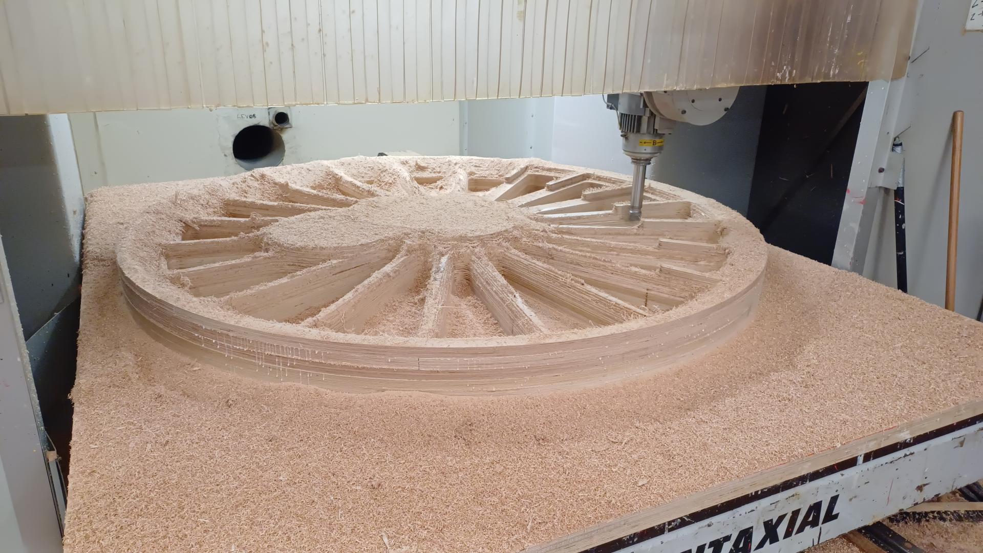 Our design team have been working with William Cook Cast Products to produce the CAD model for the central driving wheel. This has been supported by a visit to 70013 Oliver Cromwell at Loughborough to laser scan the driving wheels. WCCP were thinking that they would have to manufacture the casting pattern as a manual process. However the modelling has been so successful that WCCP are able to use their CNC pattern making machine using the model as input data. Here the machine is working on the ribs which will support the balance weight plate ribs. On the central driving wheel there are 7 ribs on either side of the spokes; 5 on the leading and trailing driving wheels. | |