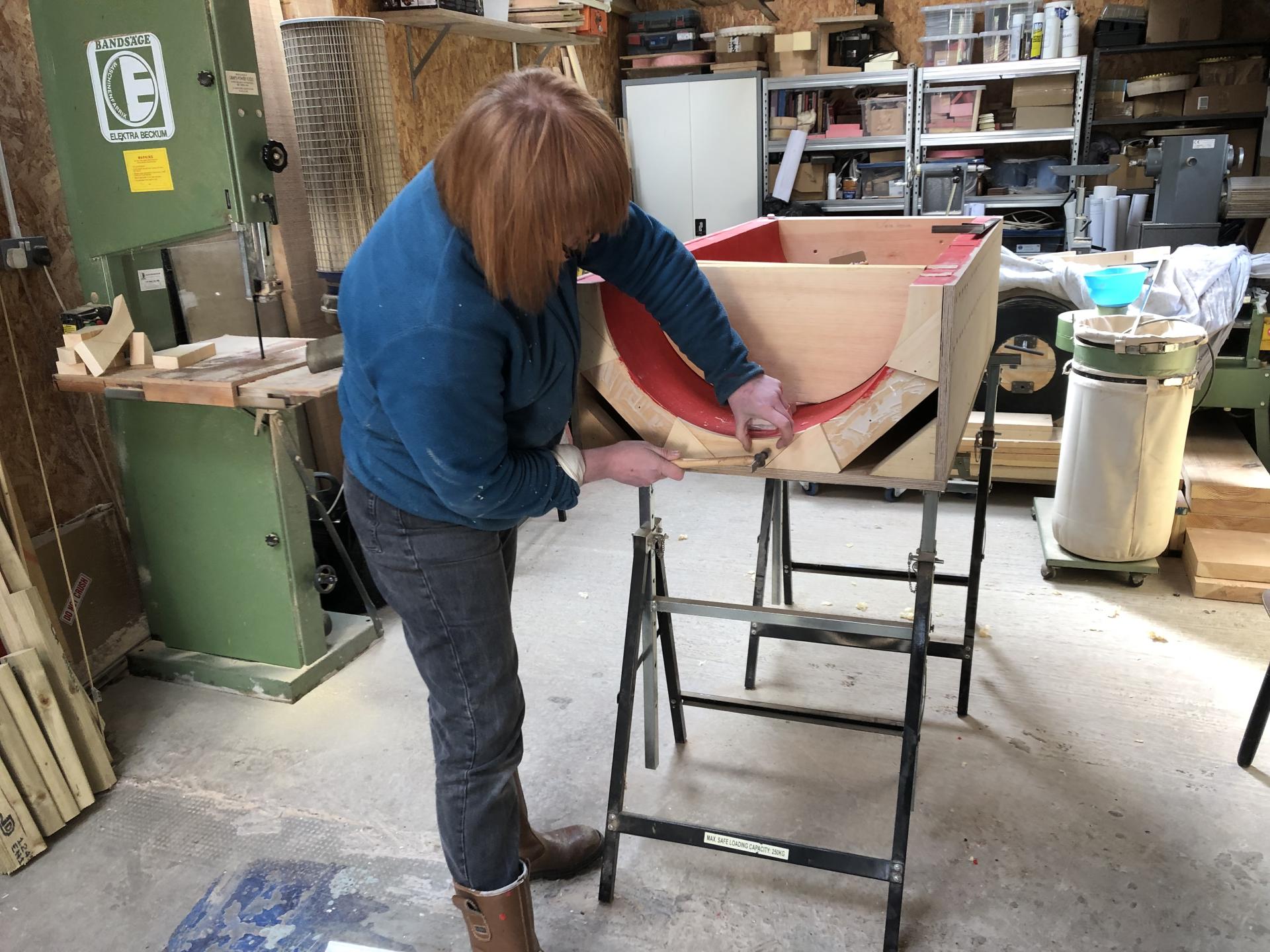 Tony reports on the latest progress "We’re currently working on the lower section of the main cylinder core box (the box that will make a circular plug of sand to create the void in the cylinder casting). The end caps are now complete and the fasteners added. The end caps have draft (a slight taper) of about 3/16” built into them to allow the moulder to tap the core out. In this case we’ve made the end caps removable and the moulder will probably turn the whole box upside down, remove the end caps, knock the bottom and lift the core box off. We’re also adding four handles to allow the box to be lifted off the core or generally carried. Ruth adding final pieces to achieve the correct overall length of the cylinder core plus the core prints (the extensions to the core that will support the core in the main pattern mould.) ." |