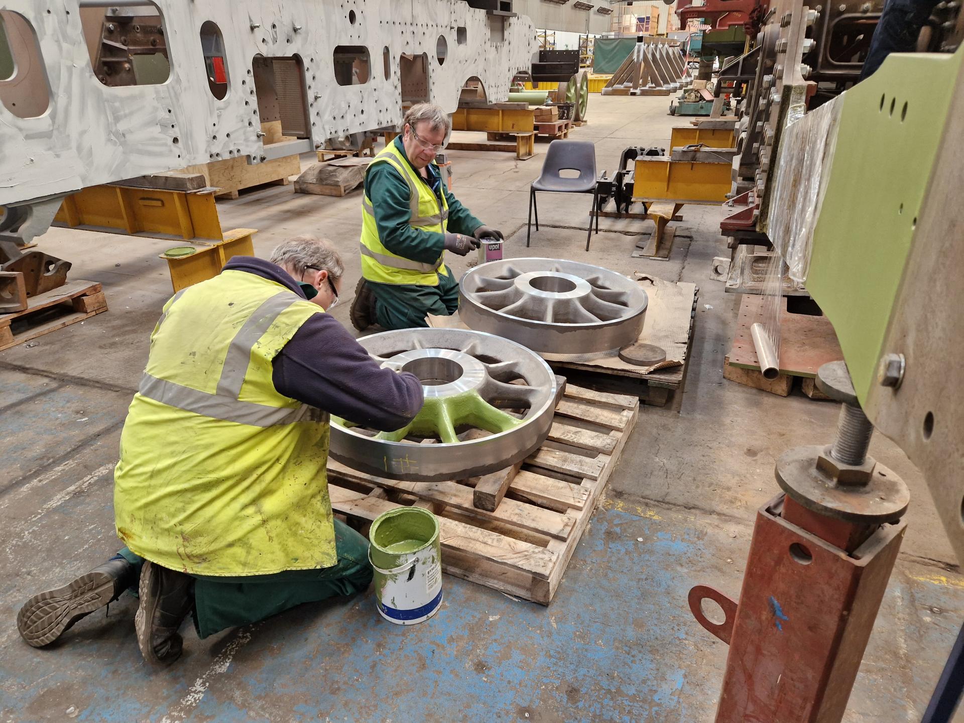 Our Pony Truck wheels have been cast at Trefoil Steel Co Ltd and machined at L&H Engineering Limited in Worksop. Today, Geoff, John and Harry went to Worksop for final inspection. Both wheels have checked out OK and will be delivered to CTL Seal, tomorrow on Friday 12 April, just in time for the Open Day on Saturday. Final machining will be completed after the wheels have been pressed onto the pony truck axle. | |
