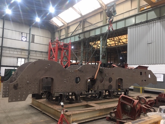 Today's visit to CTL Seal for our usual weekly working party enabled us to get this latest view. The frames have now been bolted to the three lower cast stretchers and have most of the internal items in place. The whole structure has been mounted on adjustable frame stands, four are situated inside the frames between the lower stretchers with a further two supporting the front of the frame assembly. | |