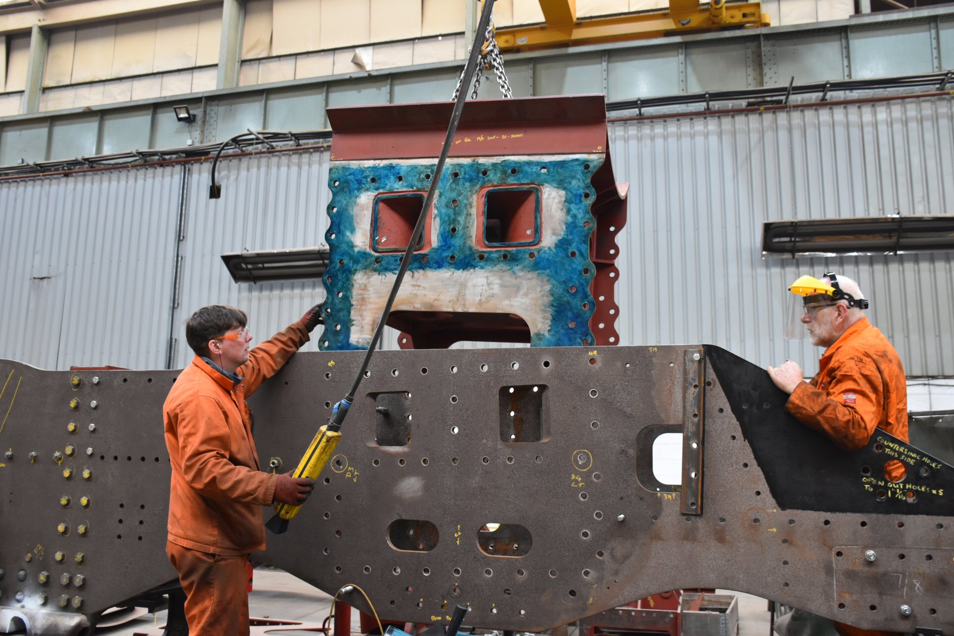 Over the last couple of weeks, we’ve been posting pictures of new parts. This week’s update shows some work on the smokebox saddle. We were unhappy with the fit of the smokebox saddle in the frames and decided that it had to come out for checks. It is only fitted with temporary bolts and can only be finally bolted up when the cylinders are in place. The bolts for the final fit will be 90 ‘fitted bolts’, each made to be an exact interference fit for its hole and run from the cylinder, through the frame and smokebox saddle. We found small localised high spots that meant the saddle was not sitting flat on the frame. The adjustments took place over a couple of days last week and the high spots were ground off the frame and saddle. Each side was dealt with separately and it was grind, refit, bolt up tight to get witness marks, remove, inspect. This was repeated till the size of the witness mark was satisfactory and we were happy with the fit. Here you can see the saddle being lifted into the frames. The side face of the saddle has been covered with engineers blue. Once all of the bolts have been tightened, the blue will transfer to the frames to show where the saddle is touching the frames. You can see a short time-lapse video is off the team lifting the saddle in and bolted it up for the last time by following this link. The next jobs on the frames are hot riveting the front buffer beam and fitting the frame extensions at the rear of the engine. |