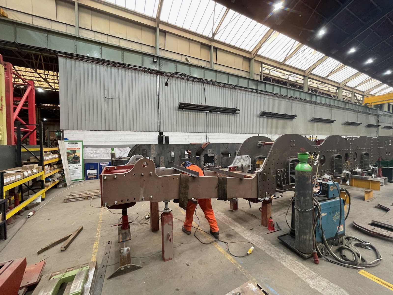 CTL Seal have started to erect the frame extensions and the components at the rear of the frame extensions. In the photo, on the right, the front firebox support stretcher has been refitted. On the left is the dragbox. The frame extensions and components will be assembled with loose bolts so that the components can be checked for squareness. It will also be important to set the rear ends of the frame extensions at the right height relative to the main frames. | |