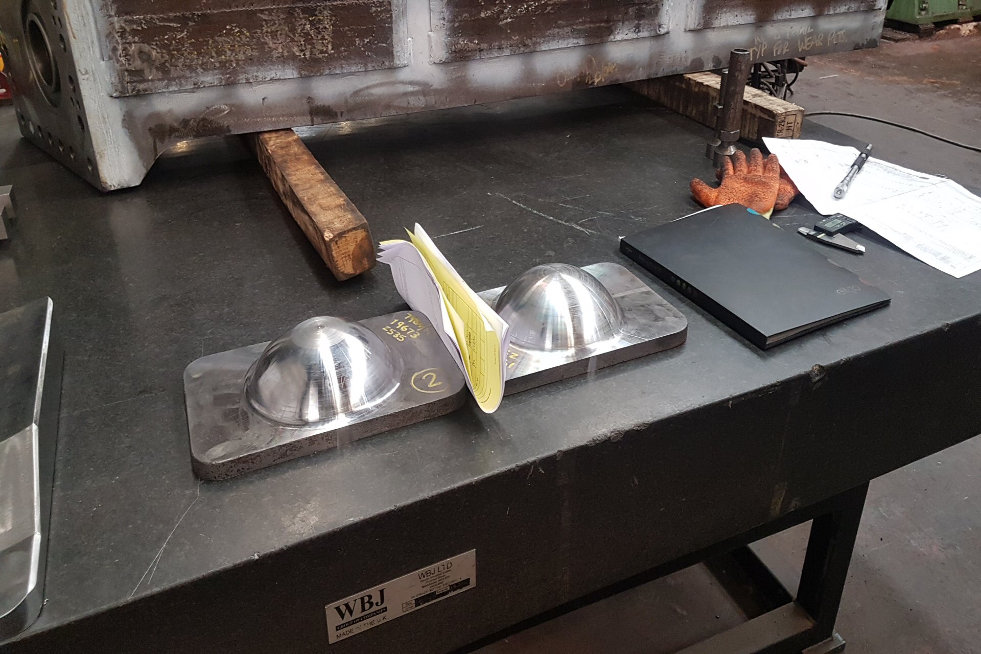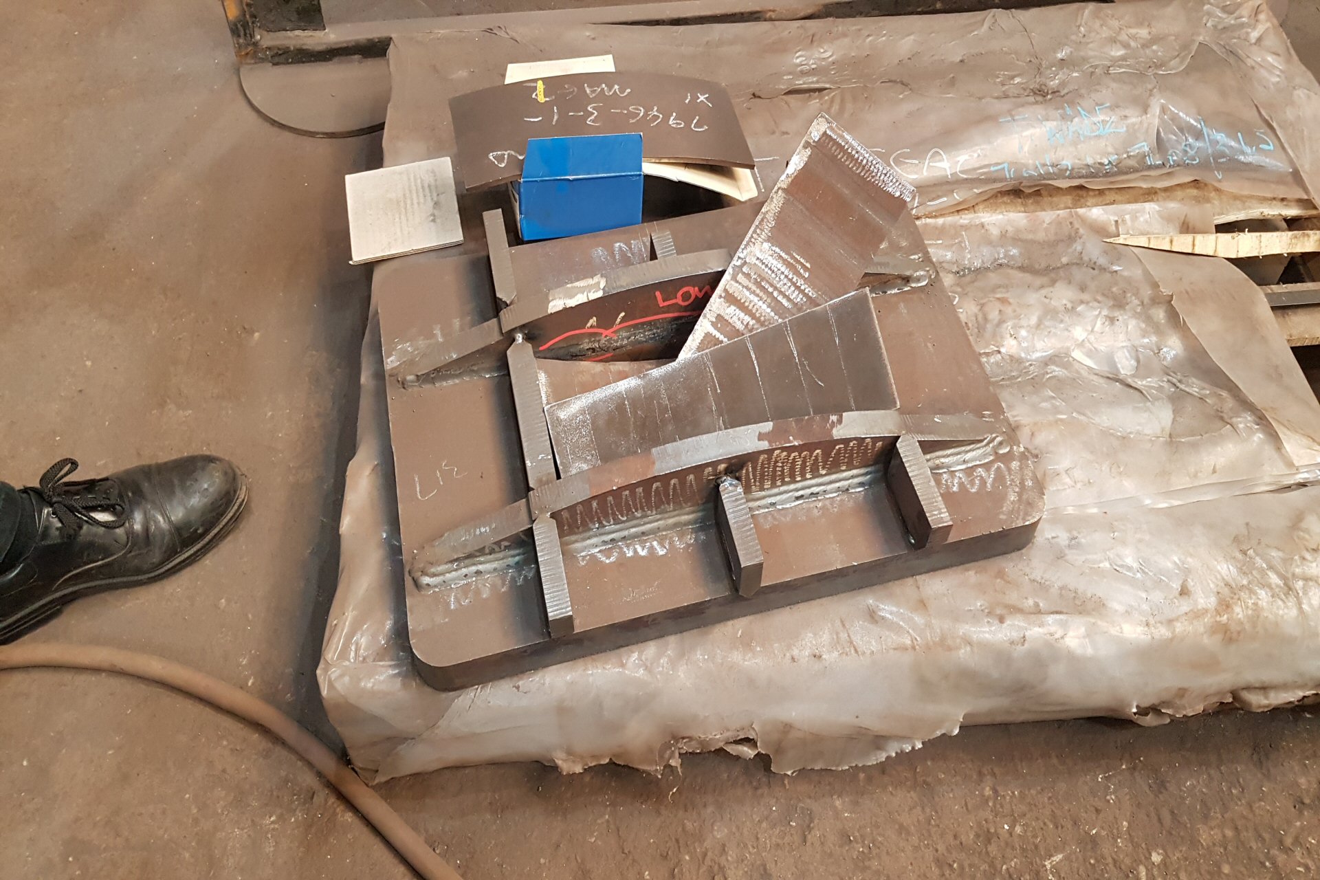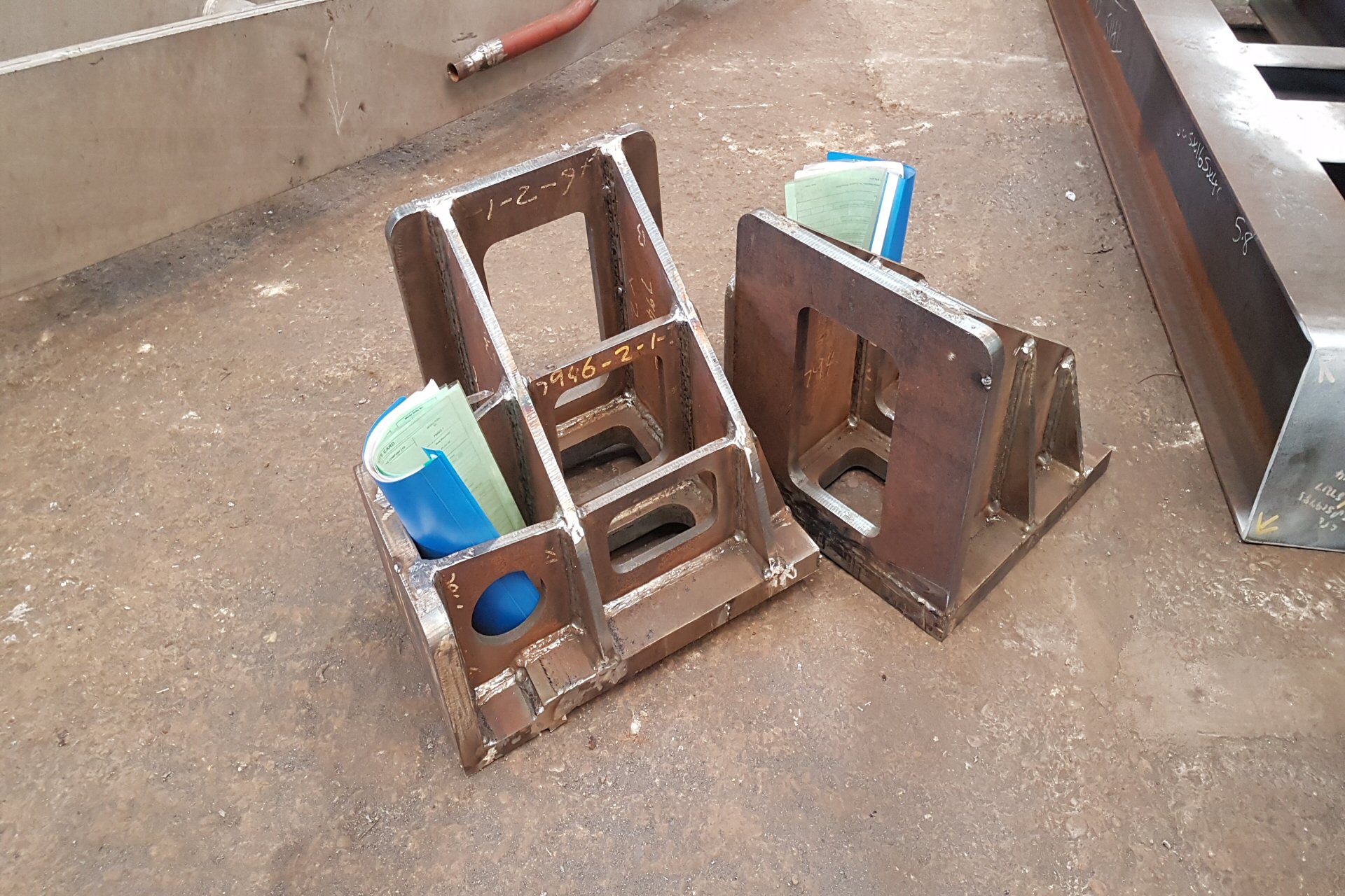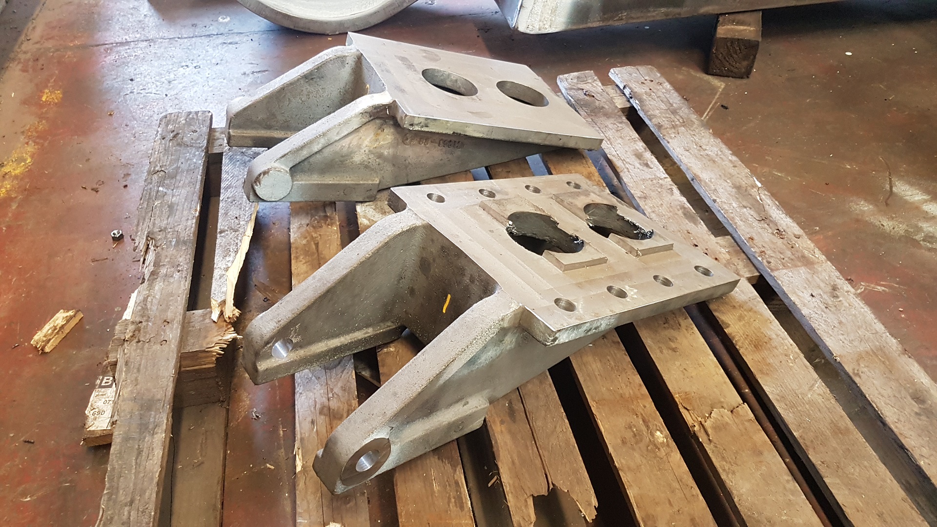Meanwhile, over in the fabrication shop are the 2 hind beam gussets. These reinforce the back end of the frame and transfer the weight of the rear of the locomotive to the trailing truck. The bolsters bolt on the bottom which is the left hand side of the left hand gusset. These are in the fettling area where they will be tidied up before transferring to the machine shop for the bolt holes to be drilled. In BritishRailways days, these were castings. As the shape lends itself to fabrication, we have fabricated them using full penetration welding. |