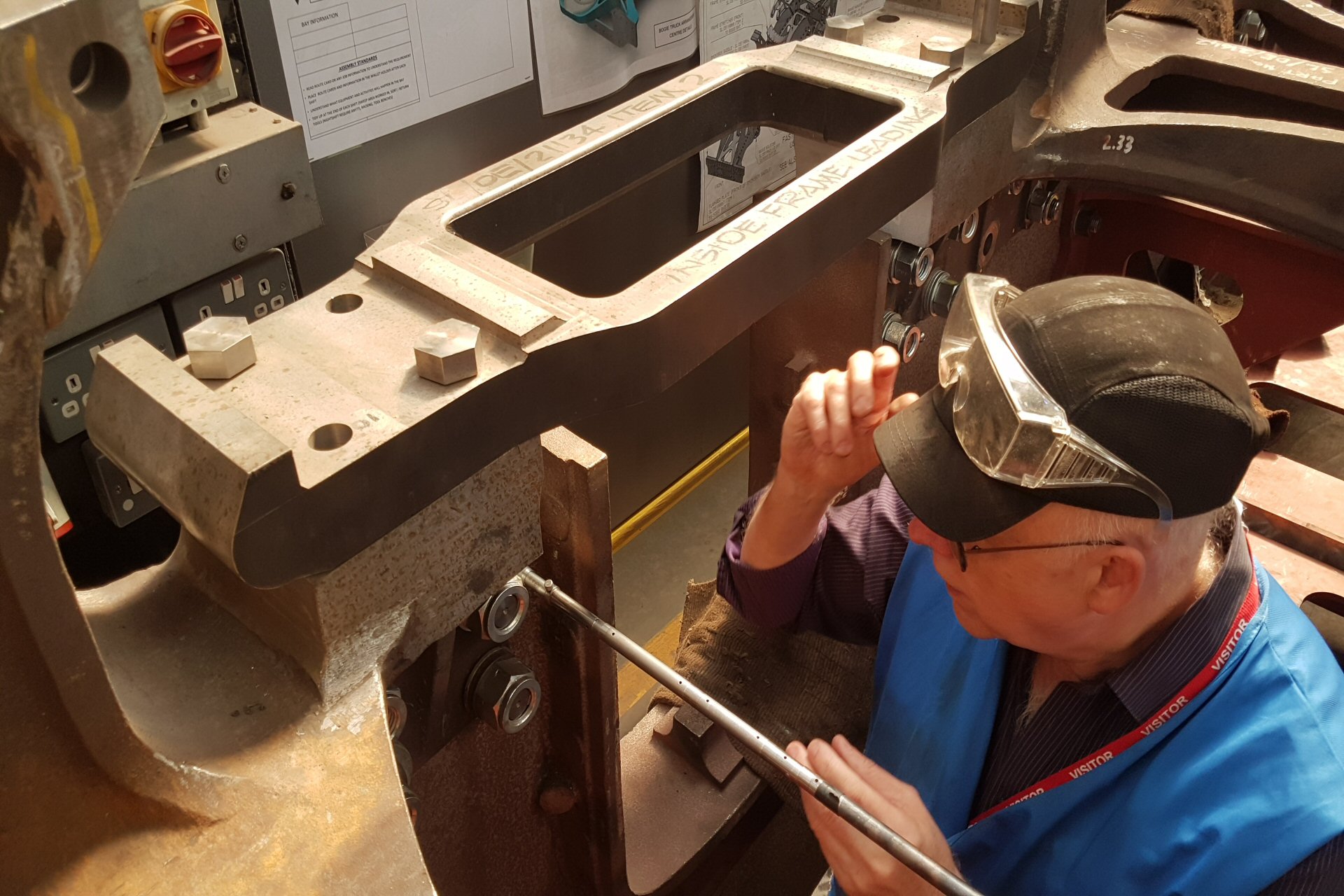 The frames are now scheduled to go into the machine shop for hornguide machining at the beginning of September. In the image, the hornguide is the U shaped flange next to John Hind's right shoulder, the frames are currently upside down. In preparation for machining, today we took a series of measurements across the frames; John is using an inside micrometer for this job. For the weekend of 29/30 August, the plan is to replace the 4 bolts adjacent to the hornguides with rivets - this makes 48 in total, 8 per hornguide. There is insufficient clearance between the frame/stretcher bolts (horizontal) and the frame keep bolts (vertical). By changing the horizontal bolts with rivets, it means we can extract the frame keep bolts in the future, should this be needed. The frame keep can be seen above John's head. This is currently the right way up as it is being used to clamp the frame in this area. Once the hornguide has been machined, it will be removed so that the top and bottom faces can be machined on the keep. |