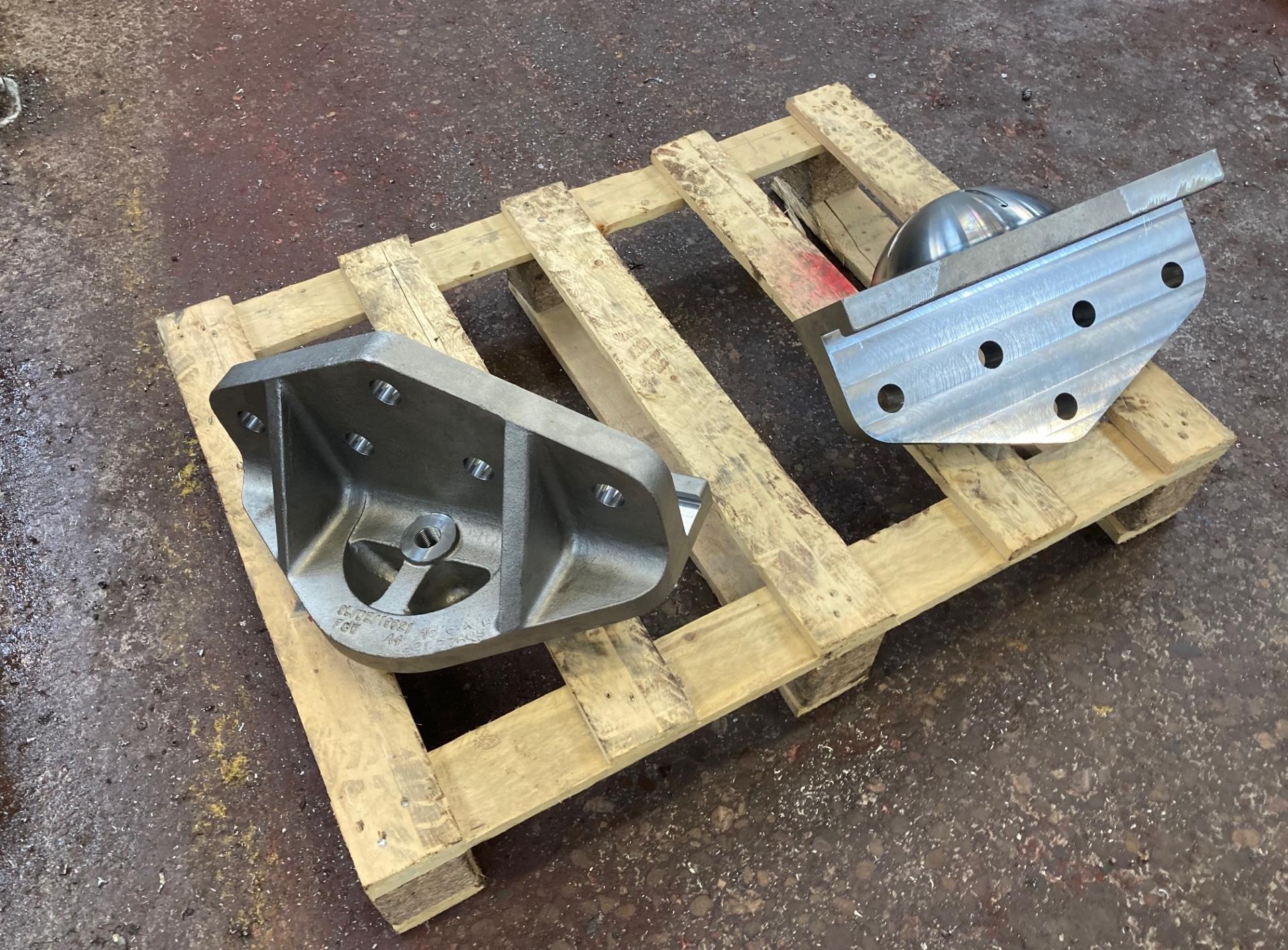 Bogie bolsters are fitted to the underside of the frames and their job is to transfer the weight of the front of the locomotive to the bogie. The bolsters rest in bolster cups that sit on brass pads bolted to the top surface of the central bogie stretcher. As the bogie pivots around the central pivot, the bolster cups can "float" over the brass pads. The bolsters are grease lubricated through the central hole seen on the left hand bolster. A pair of bolsters had been manufactured many years ago but, unfortunately, no paperwork could be identified. As we felt that the bolsters were a critical component, we felt that they had to be scrapped and replaced. The bolsters were cast and machined by Furniss and White in Sheffield. Photograph courtesy of Josh Kershaw |