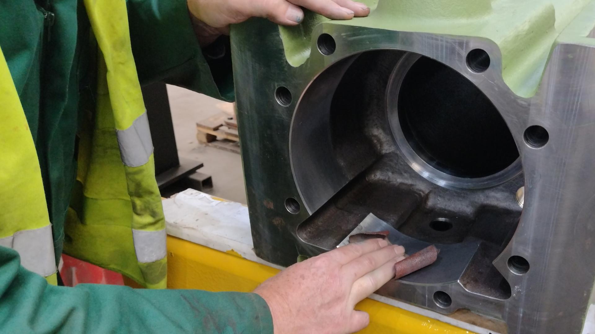 As part of our checks before sending the bogie cannon axleboxes to the South Devon Railway, we are checking the fit of the the parts. Here Geoff Turner is taking high spots off the bore of the axle boxes with fine grade emery cloth while doing a trial fit of the roller bearing outer races. |