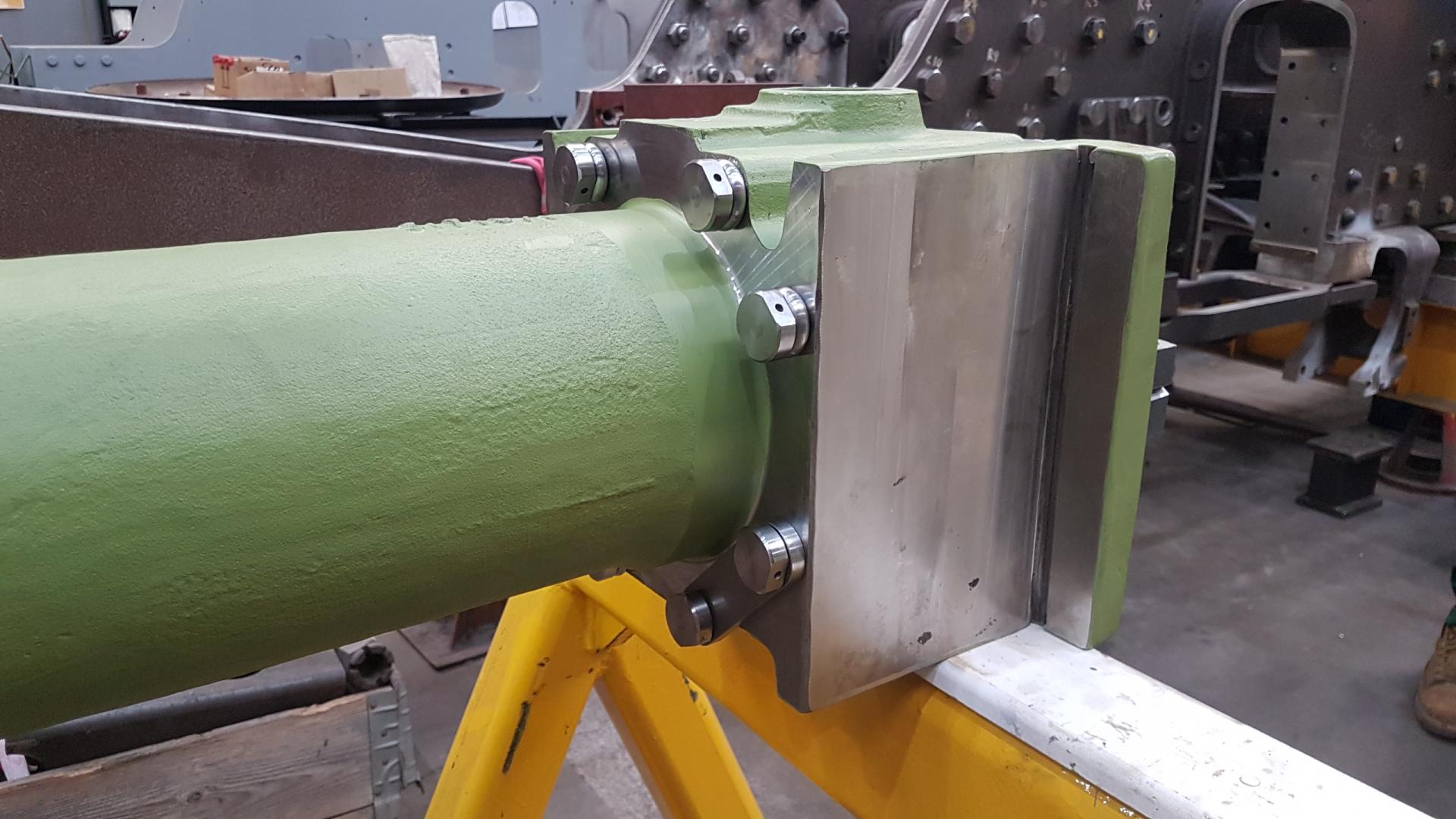 1 cannon axlebox is now ready for internal painting where we will use 2 pack, oil resistant paint. In preparation, the inside was washed out today with a Jizer degreasing spray and then cleaned out with water. Painting is scheduled to start next week. On the other axlebox, the final bearing housing has being receiving attention to ensure the correct fit of the bearing. We also test fitted the end covers and the enclosure ring. All of these are in halves so that they can be removed to allow bearing inspection. The bronze ring is the enclosure ring with the grooves of the labyrinth seal visible |