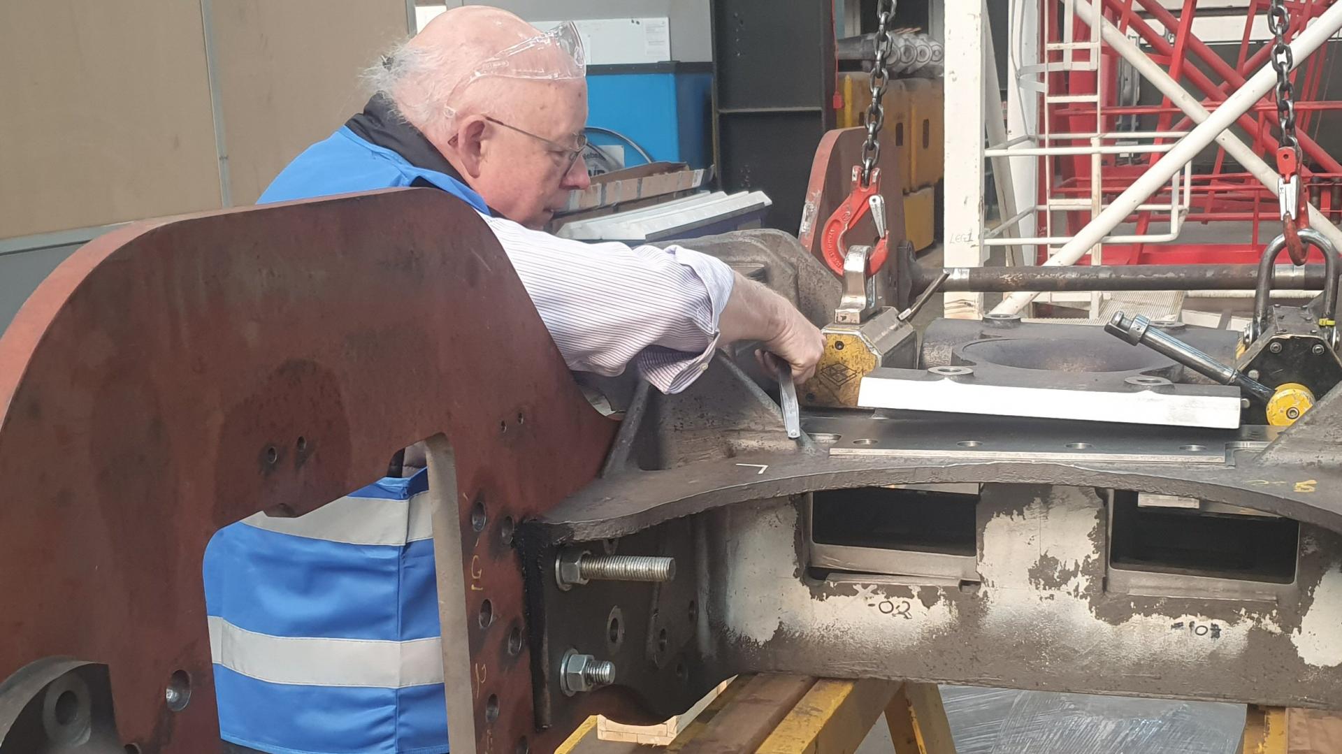 Jamie Black, the machine shop manager at CTL Seal, measures the bogie centre slide with a large external micrometer to agree the work required. The slide only needs a light skim on the machine to get the correct clearance. |