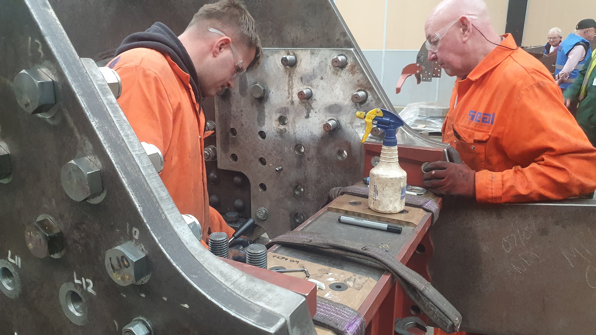Today was the first trial assembly of the bogie frame; Chris and Bob take a breather from our efforts. We still have to fit the AWS receiver stay between the lifeguards - we have this in stock. SSLC's Monday Gang have been trained in use of the overhead crane at CTL Seal which makes the job a lot easier |