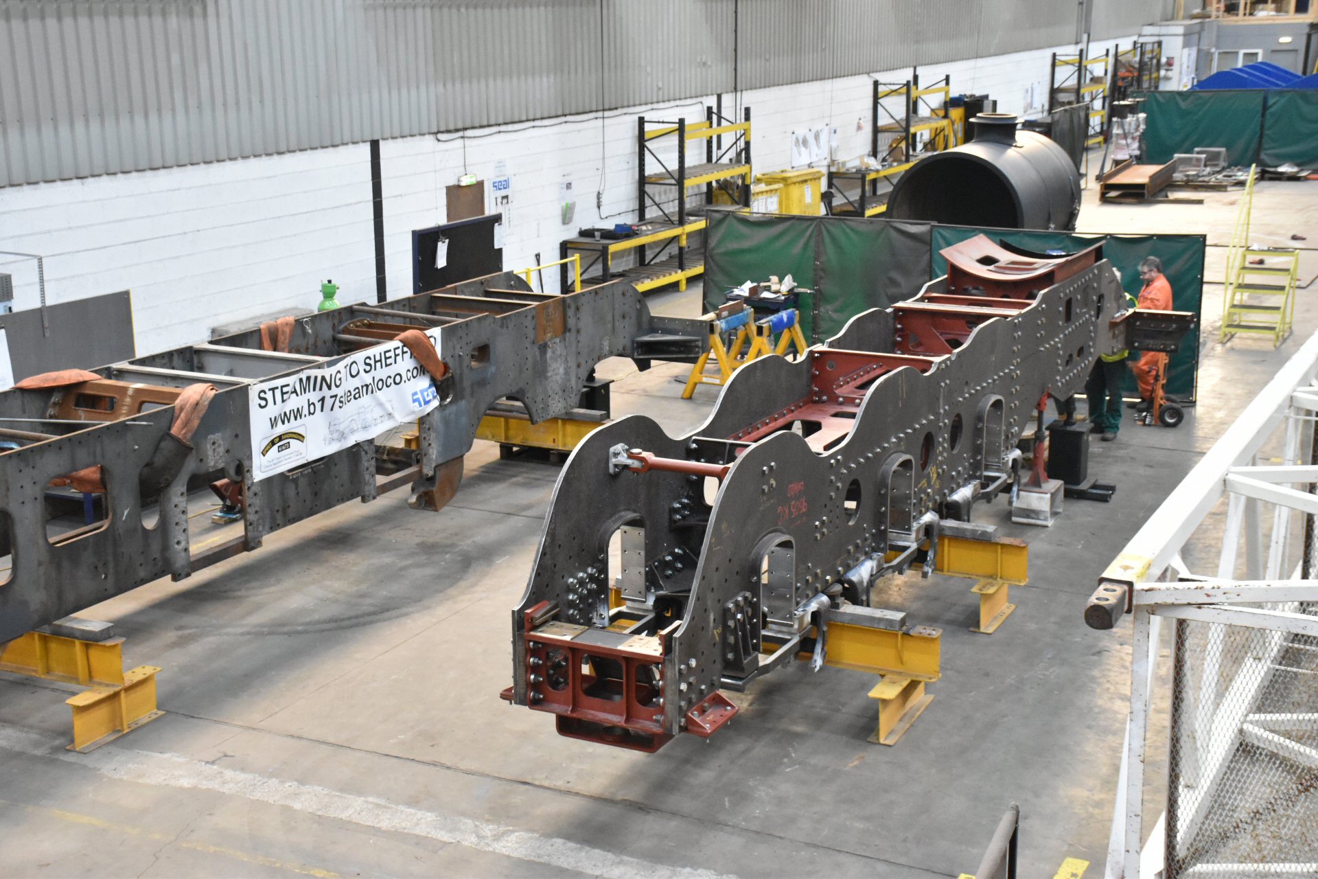The frames are now back in the assembly shop and have been turned the correct way up. They are sitting alongside the frames for the B17 Sandringham project. We've set them up so that they sit at a representative height as if the wheels were on. At the moment we're working on the buffer beam components to establish the right order of assembly - the buffer beam assembly will use hot rivets. We should be starting to erect the frame extensions soon - the rear of the frames is nearest the camera. If you look closely at the photo you will see temporary packing plates between the firebox support (in red primer) and the frames. These will be removed prior to fitting the extensions. |