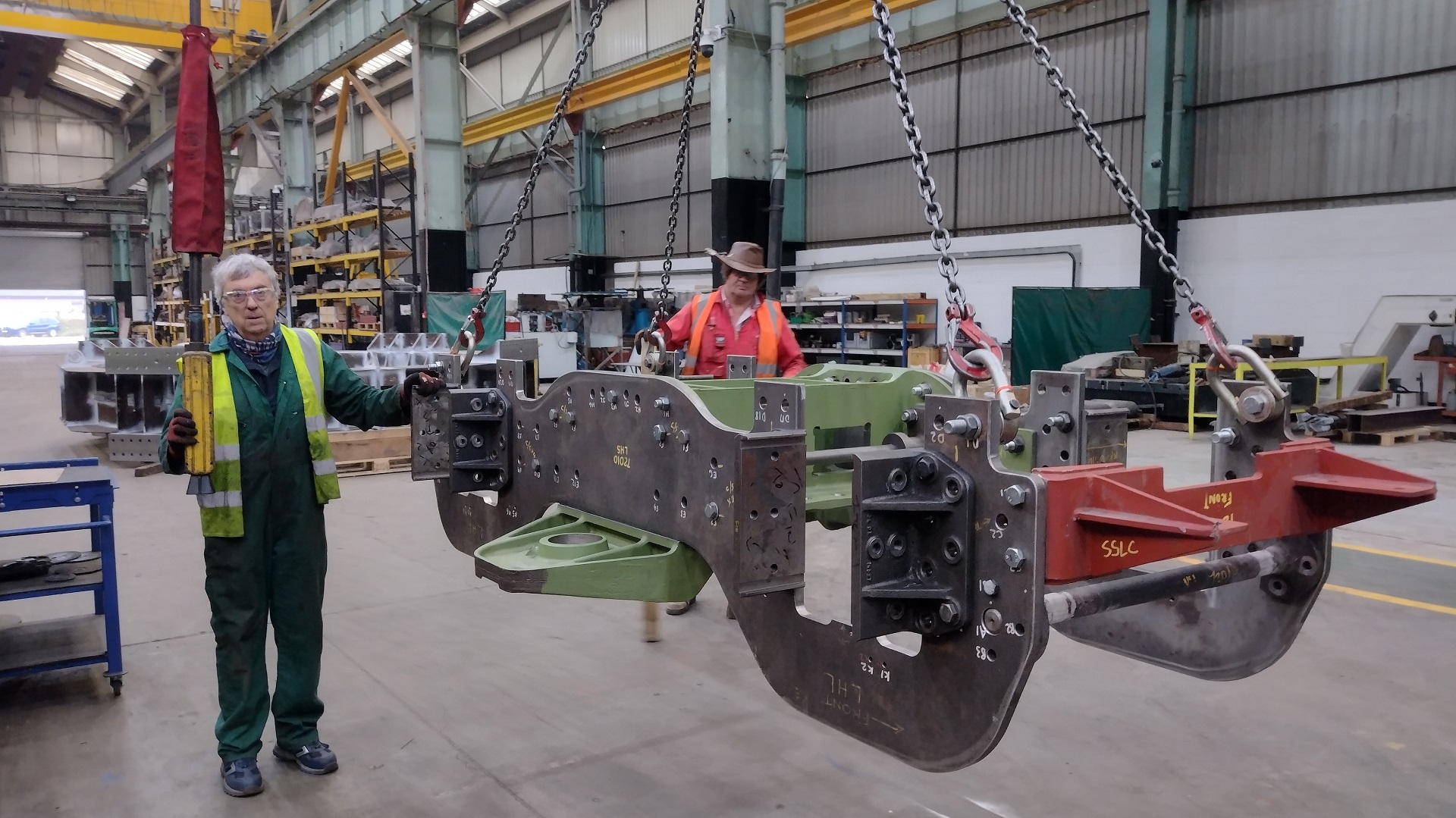 The bogie frame needed to be moved to a display position for the AGM. 4 of our team have been trained by CTL Seal to use the overhead cranes. Here Mike and Ian move the upside down bogie frame out onto the main floor so that Craig from CTL Seal can turn it right way up. Photo by John Hind |
