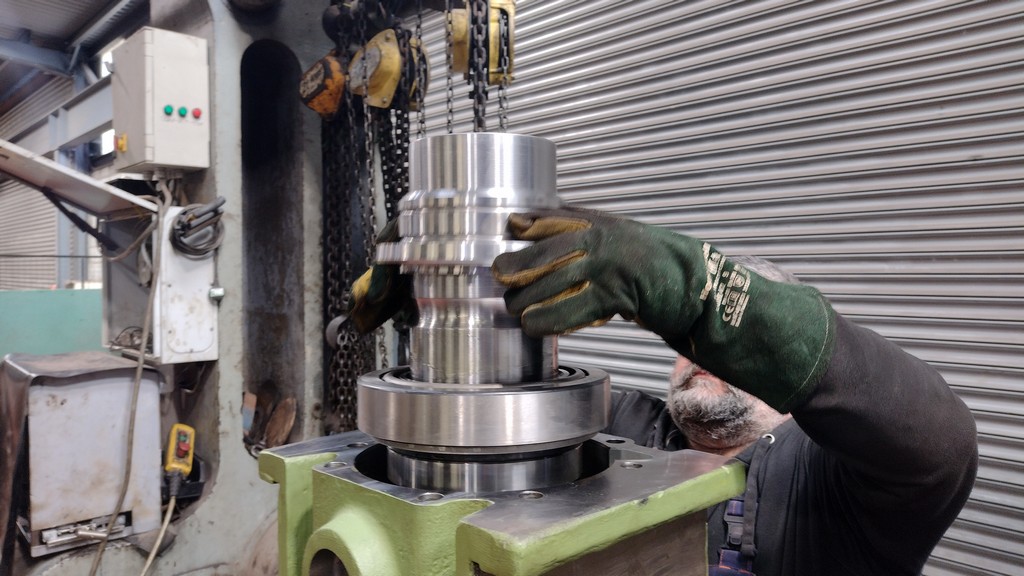 Our bogie wheelset components are at South Devon Railway Engineering in Buckfastleigh for assembly. The cannon box and axle are placed vertically. Then the the parts that fit on the axle - the abutment ring, roller bearing and enclosure ring and flinger are expanded by heat on an induction heater and lowered one by one into position. |