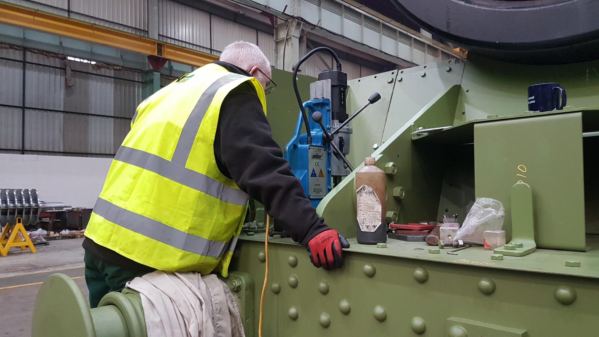With the bearings fitted in both ends of the cannon box, John checks the radial clearances to ensure that the axle is sitting squarely in the bearings |