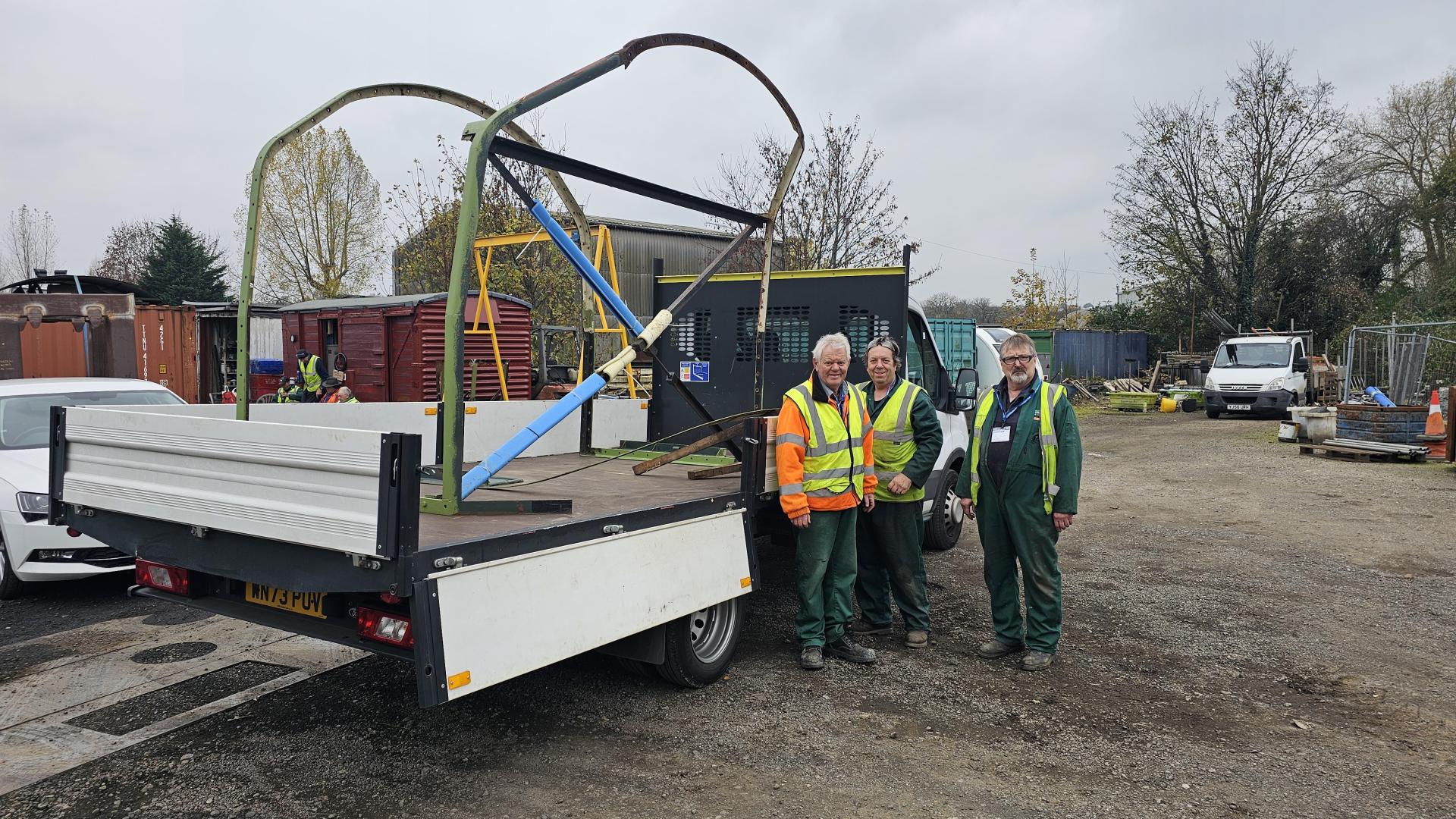 Brightstar Shotblasting and Coatings Ltd, based in Sheffield, have agreed to help us out again with blast cleaning of a few more cab components. Mike, Steve and Neil have loaded the frame and the cab back panel onto the truck prior to delivery to Brightstar. We are very grateful for their assistance. |