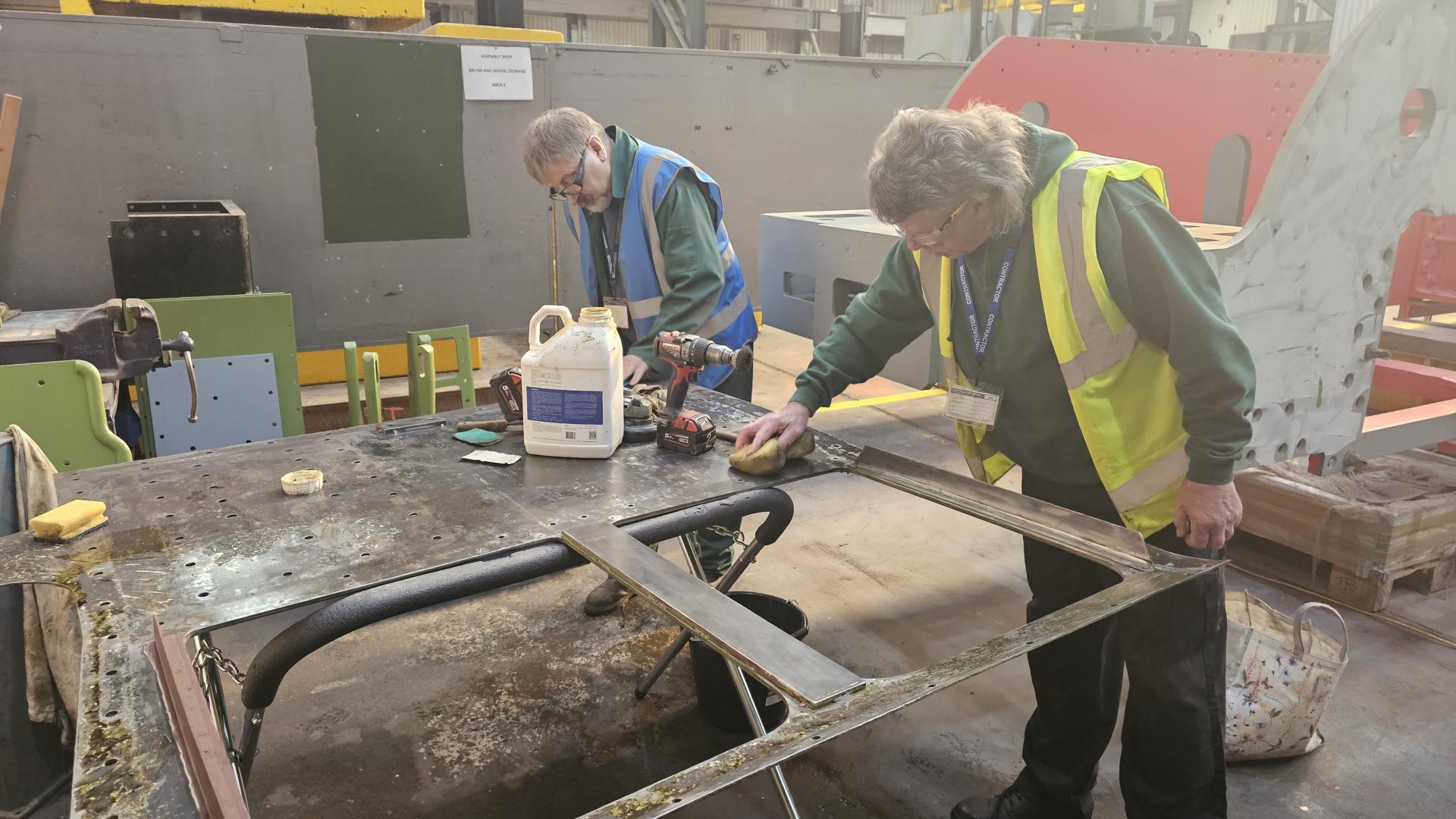 A lot of work is going into the frames, preparing them for painting. The main work is around the areas where the hornguides are welded into the frames. Here we are ensuring that the 2 components blend into each other and there are no raised edges. Here Steve P is working on the left hand trailing hornguide. |