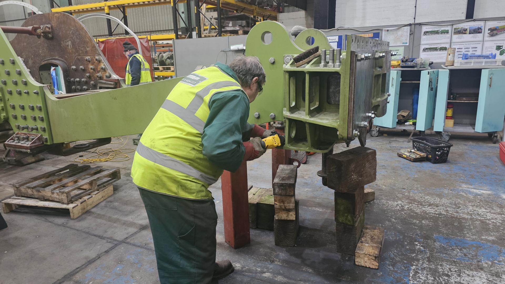 The Pony Truck bolsters are bolted onto the bottom of the gussets. Here Steve is ensuring that the gusset surface is flat so that the bolts sit firmly on the face and is using the grinder to remove any high spots. The bolts can be seen on top of the gusset. An order has now been placed for the riveting that will permanently fit the hind beam at the end of the frames. This should take place in January |
