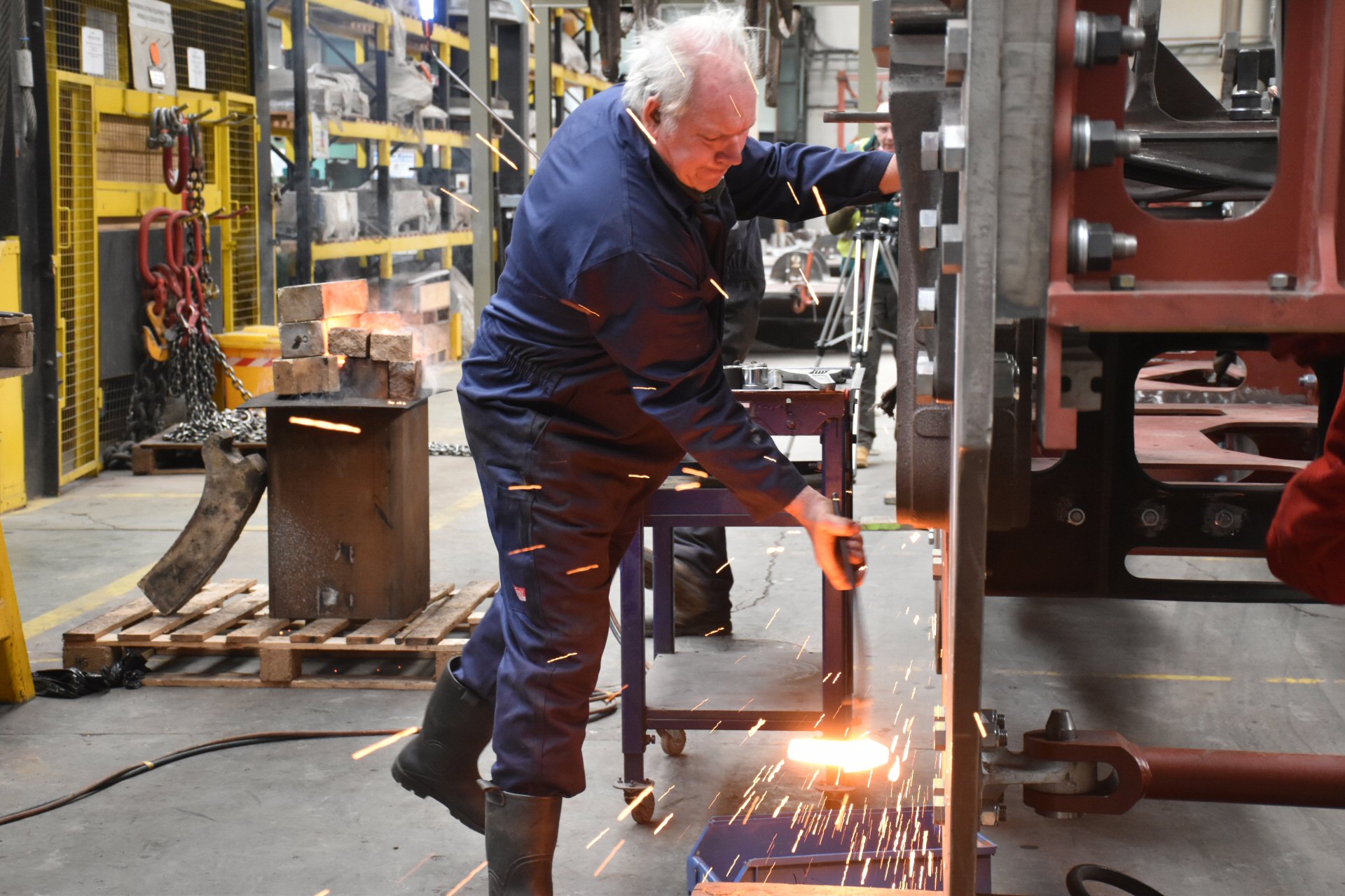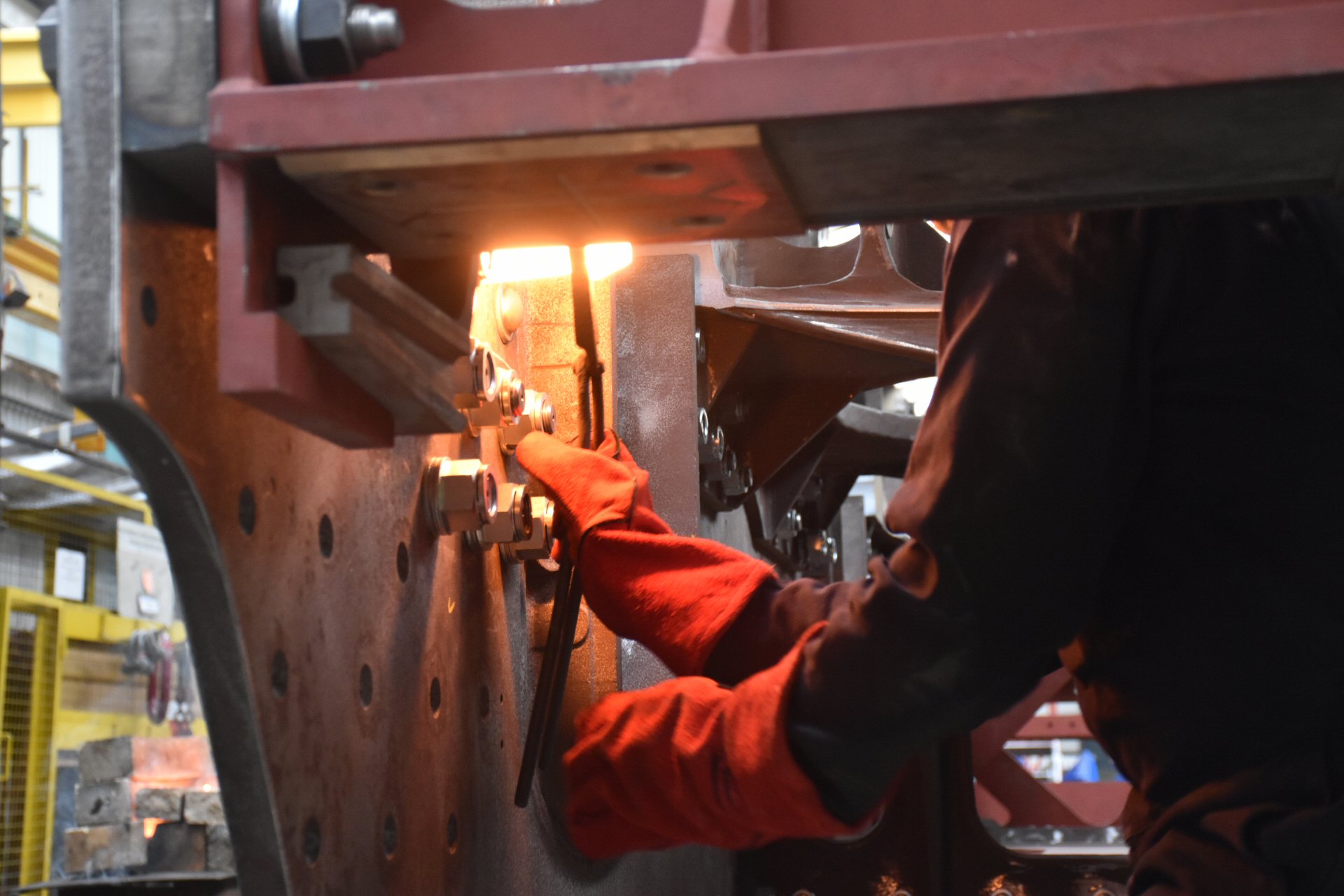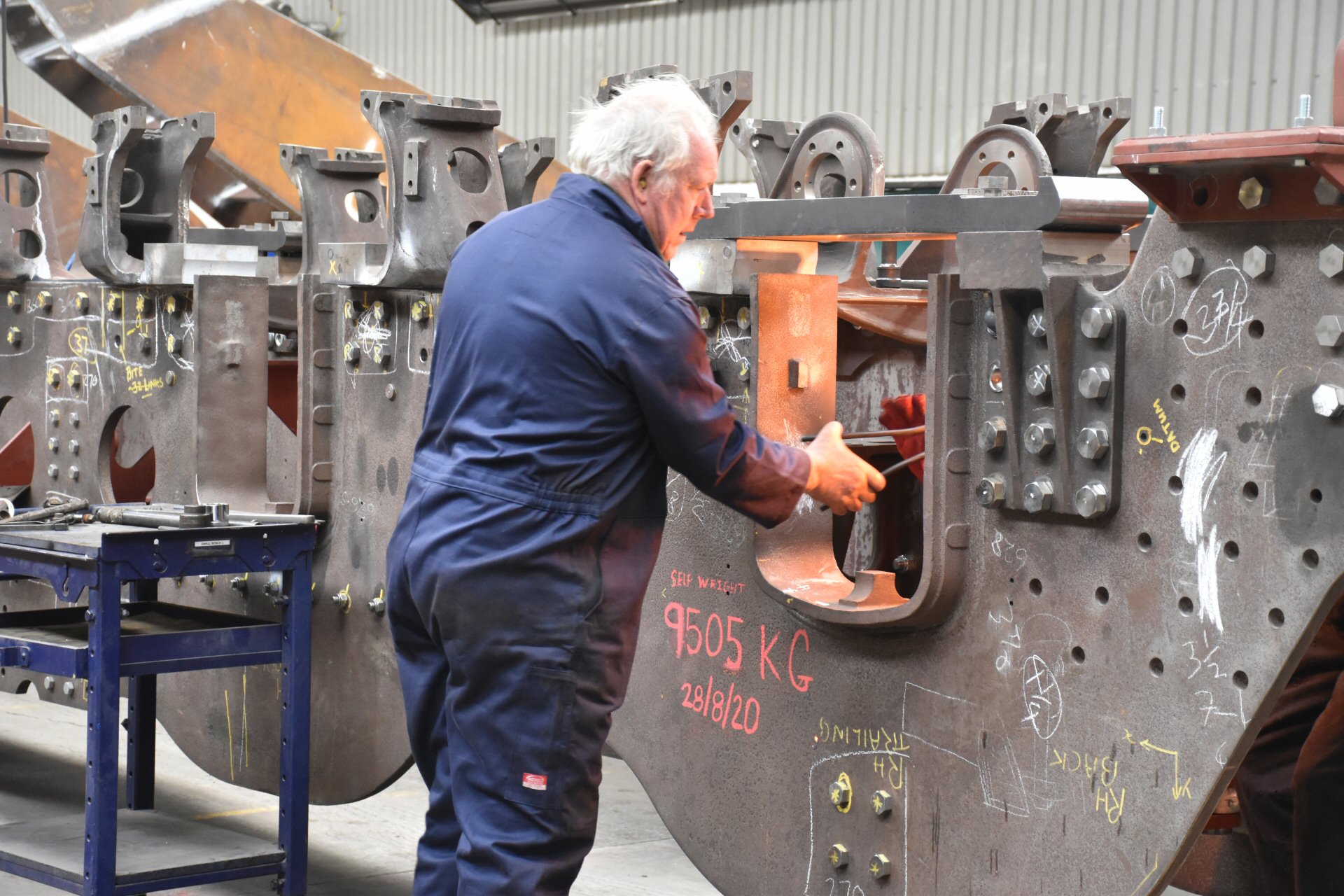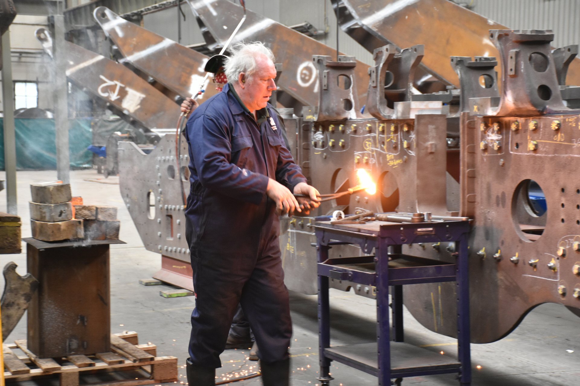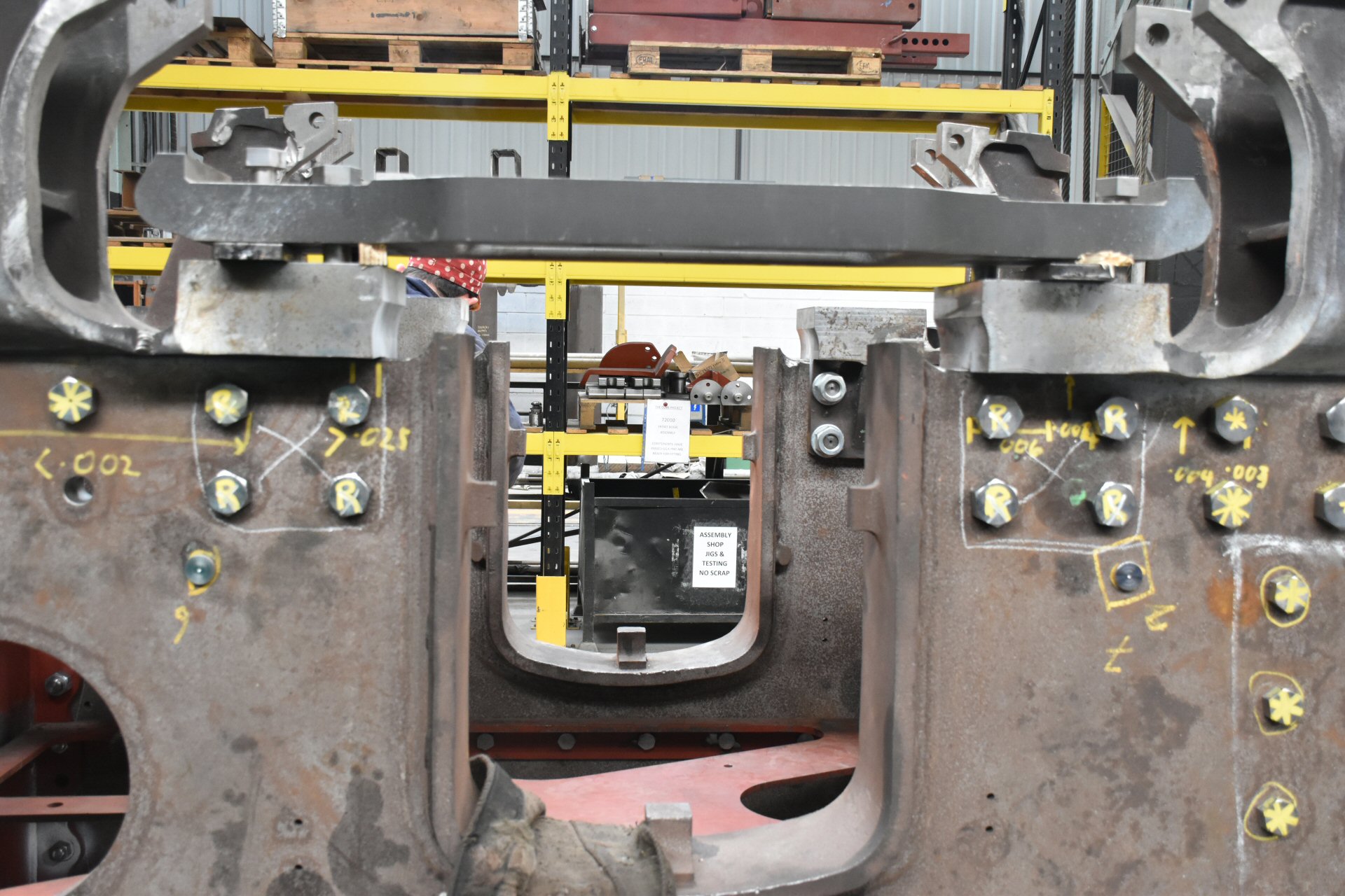 Our original design aim was to use fitted bolts when assembling the frames - the reasoning is explained in the design section of the web site. Once the frame to cast steel stretcher bolts were fitted, it became obvious that the some of the bolts were preventing the frame keep bolts from being fitted. In the image, the frames are upside down and the frame keep is at the top, itself upside down and fitted as a temporary stay. The 4 bolts each side of the hornguides marked "R" are the bolts that need to be replaced by rivets. On Saturday 29 August, Varley Boilers were on site to fit the rivets.